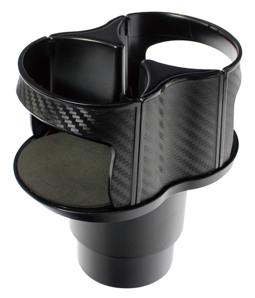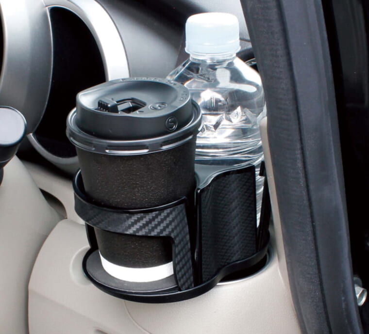 1本ぶんのドリンクホルダーを2本ぶんにできる便利アイテム。ペットボトルとカップのコーヒーなどを同時に入れることが可能だ。後席用のドリンクホルダーが中央部にひとつしかないクルマでも便利に使える。