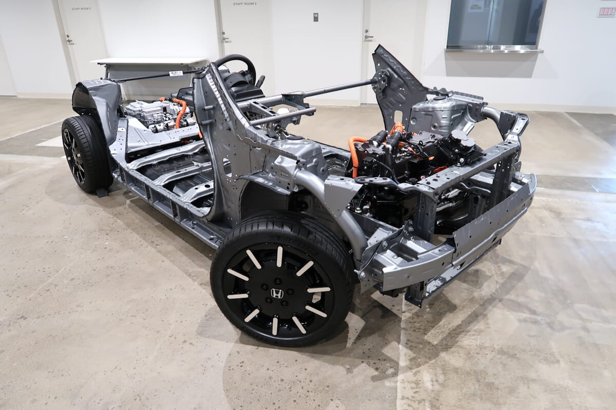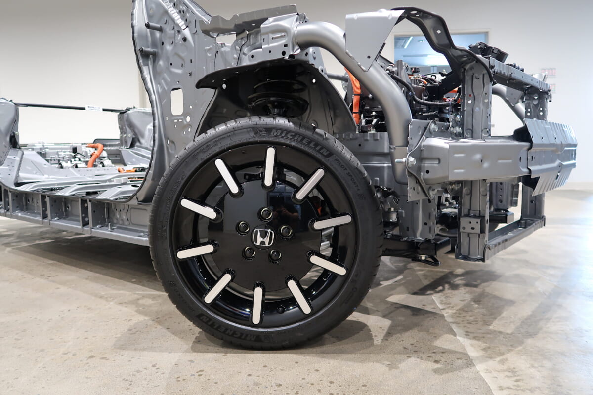 ガソリンエンジン、ハイブリッドカーはシャーシレイアウトのベースをガソリン車のものとしているのがほとんどです。対して、Honda eは当初からEV。重量物のバッテリーは低重心化し、もしもの事故の衝撃から守るためにフロア下に敷き詰められるようにレイアウトされました。当初考えられていた前輪駆動から発想を変更。駆動輪を後ろにし、モーターもリアマウントにすることで、フロントにスペースの余裕をつくりました。通常のガソリン車よりも構造材の間隔を短くし、フロントサスペンション部に有効なスペースを生みました。