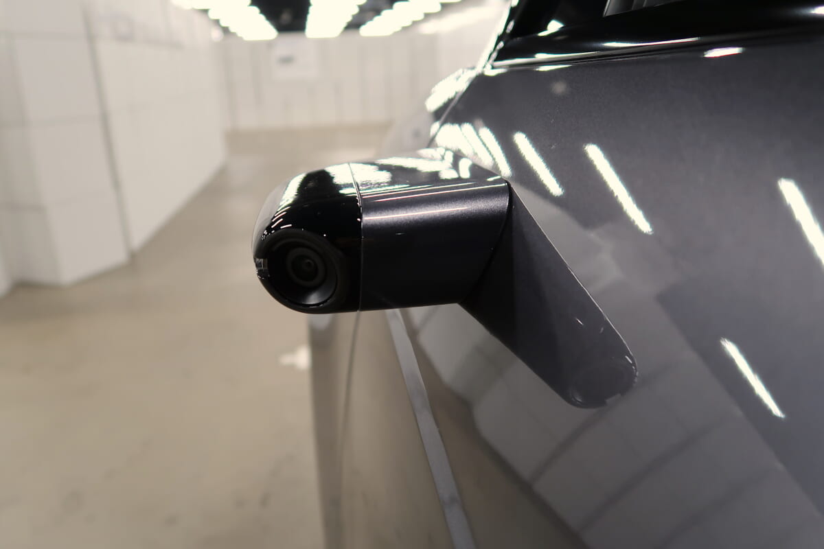 エンジンがかかり、Dボタンを押すことで走行可能となります。アクセルペダルを踏み込めば通常のクルマ同様に前進。このコースでは走り始めるとすぐに最初の直角カーブが迫ります。クルマの四隅に気を配りますが、モニターでの内側の確認にも、ハンドルの切れる感じにも違和感はなく静かにすっと曲がります。きついと思っていた狭い直角カーブもスルスルとスムーズにクリア。最小回転半径4.3mを実現させる裏にはEV専用設計のシャーシの恩恵があります。