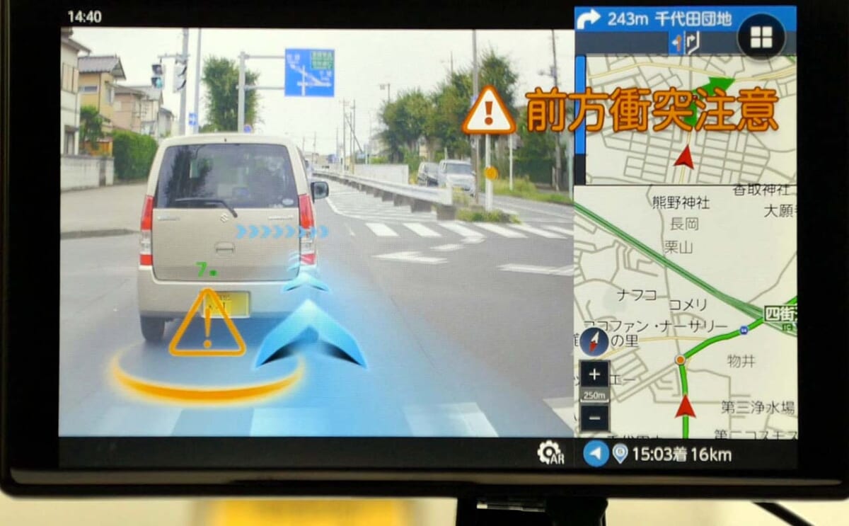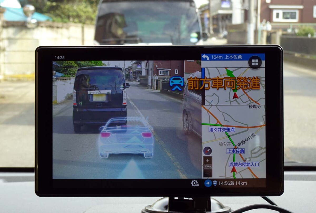 もう一つはARカメラで撮影したデータを元に3つの安全運転を支援するというものです。それは「車線逸脱警告」「前方車両発進」「前方衝突警報」の各機能で、それらの警告を画面とアラートで知らせてくれます。最近の新型車には同様の機能が搭載されていますが、本機を装着することでそれに近い機能が利用可能になるというわけです。
