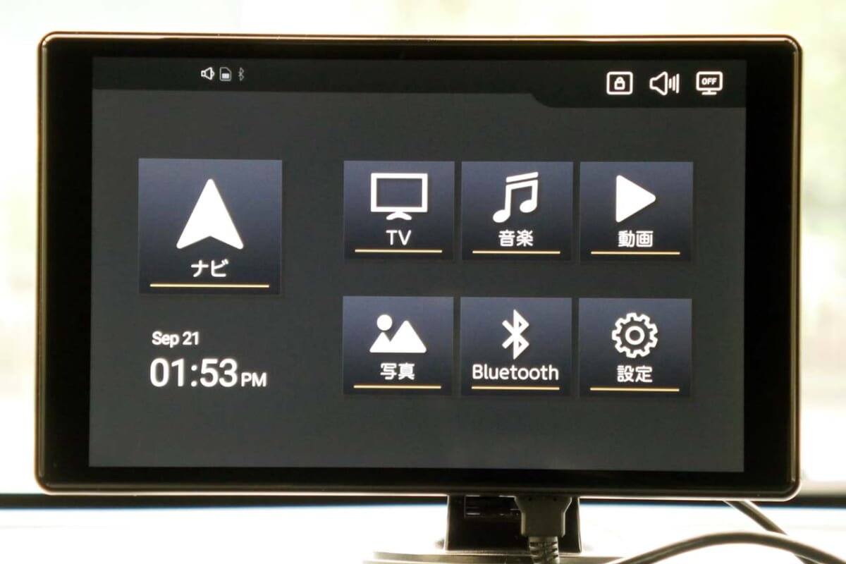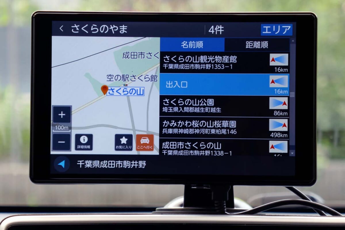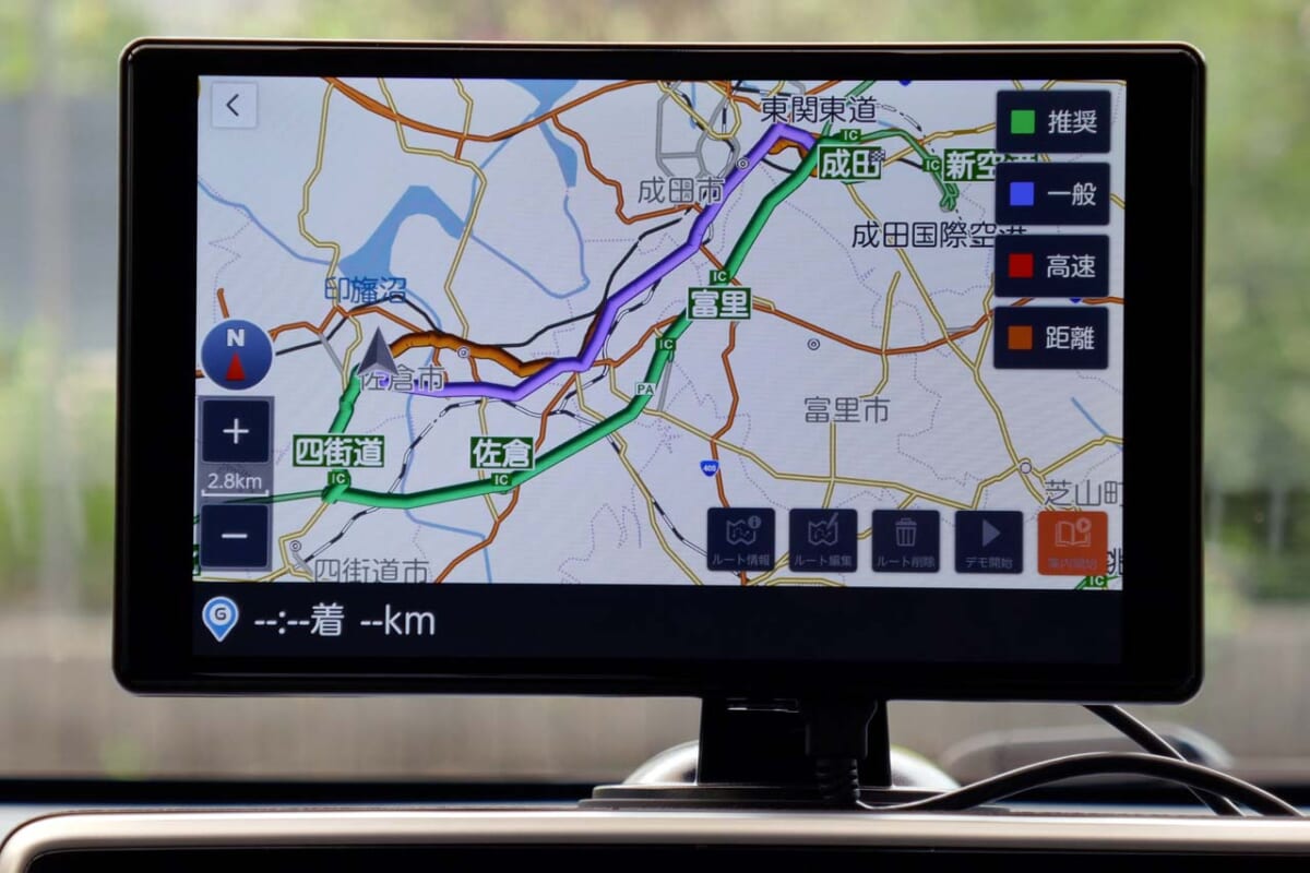 起動して真っ先に驚くのはモニターの鮮明さ。その理由は8V型のモニターの解像度はポータブル型ナビで一般的なWVGAよりもさらに高解像度な「WXGAモニター」(1280×800ドット)を採用しているからです。モニターの表面は光沢タイプなので反射が少し気になりますが、視野角が広いので反射しない角度で固定するといいでしょう。