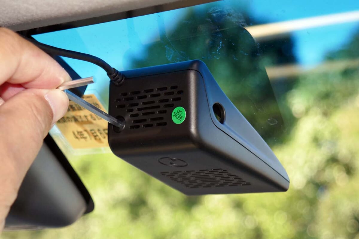 ARカメラは基本的に運転席側のフロントガラス上部に取り付けます。この時の注意点としては、取り付け位置がワイパーで拭き取れる場所を選ぶことと、映像が水平になるようナビ本体で確認することです。場所を確定する前に仮止めし、それで大丈夫か一旦確認しておくといいかもしれません。カメラの角度調整は付属の六角レンチを使います。