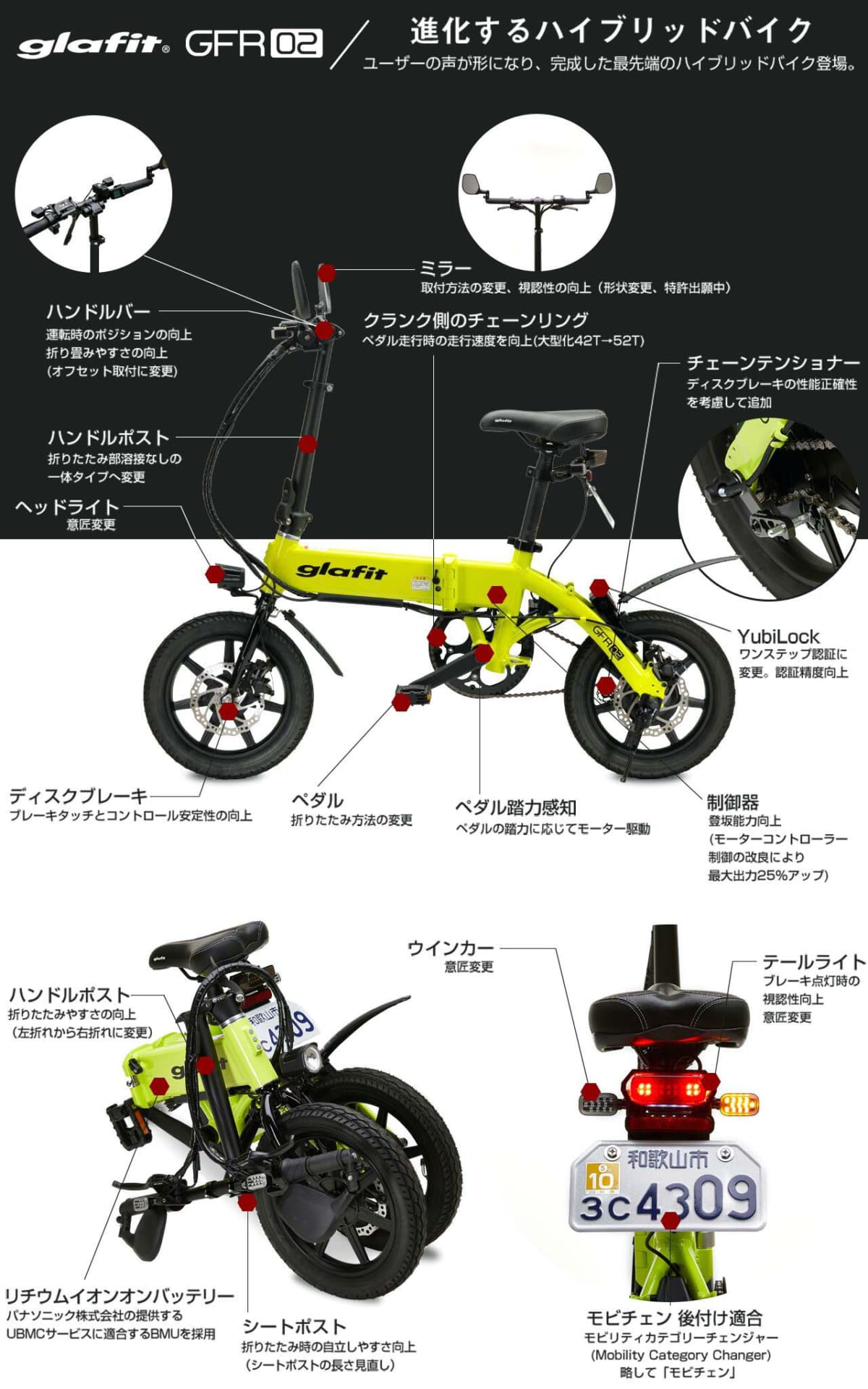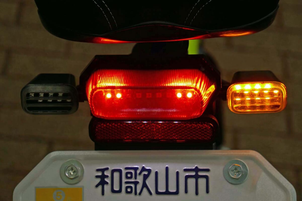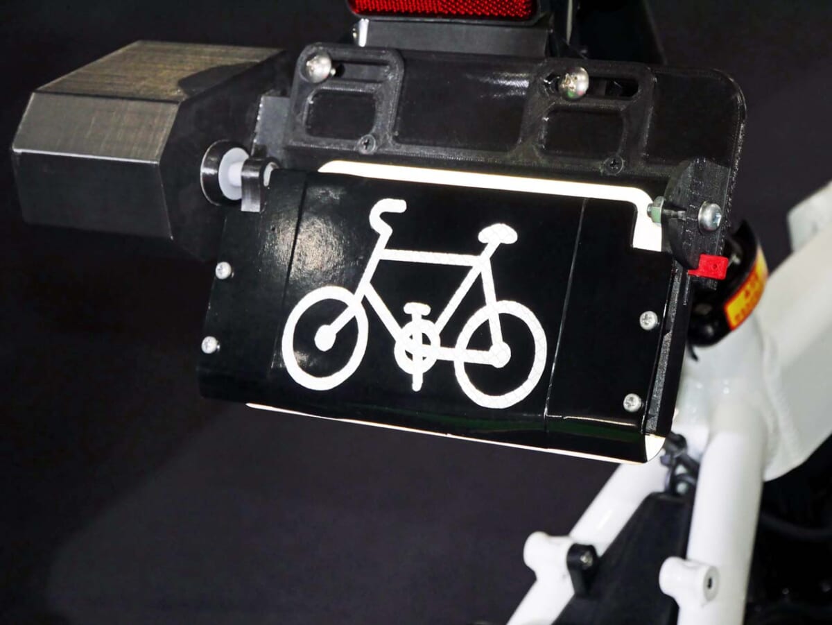 GFR-02の発表会場ではその試作品が披露されました。プレートを覆うカバーの上には自転車マークが描かれており、そのマークは外国人にもひと目で理解できるピクトグラムとなっています。さらにカバーをするにはメイン電源を切って、完全に電動バイクとしての機能をOFFにすることから始めます。その上で両手を使ってロックボタンを外してナンバープレートにカバーするのです。このモビチェンはオプションとして販売されますが、価格は未定。GFR-01では配線など引き回し等で取り付けに時間を要するとのことです。