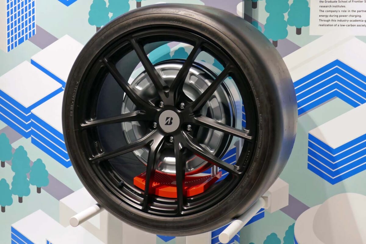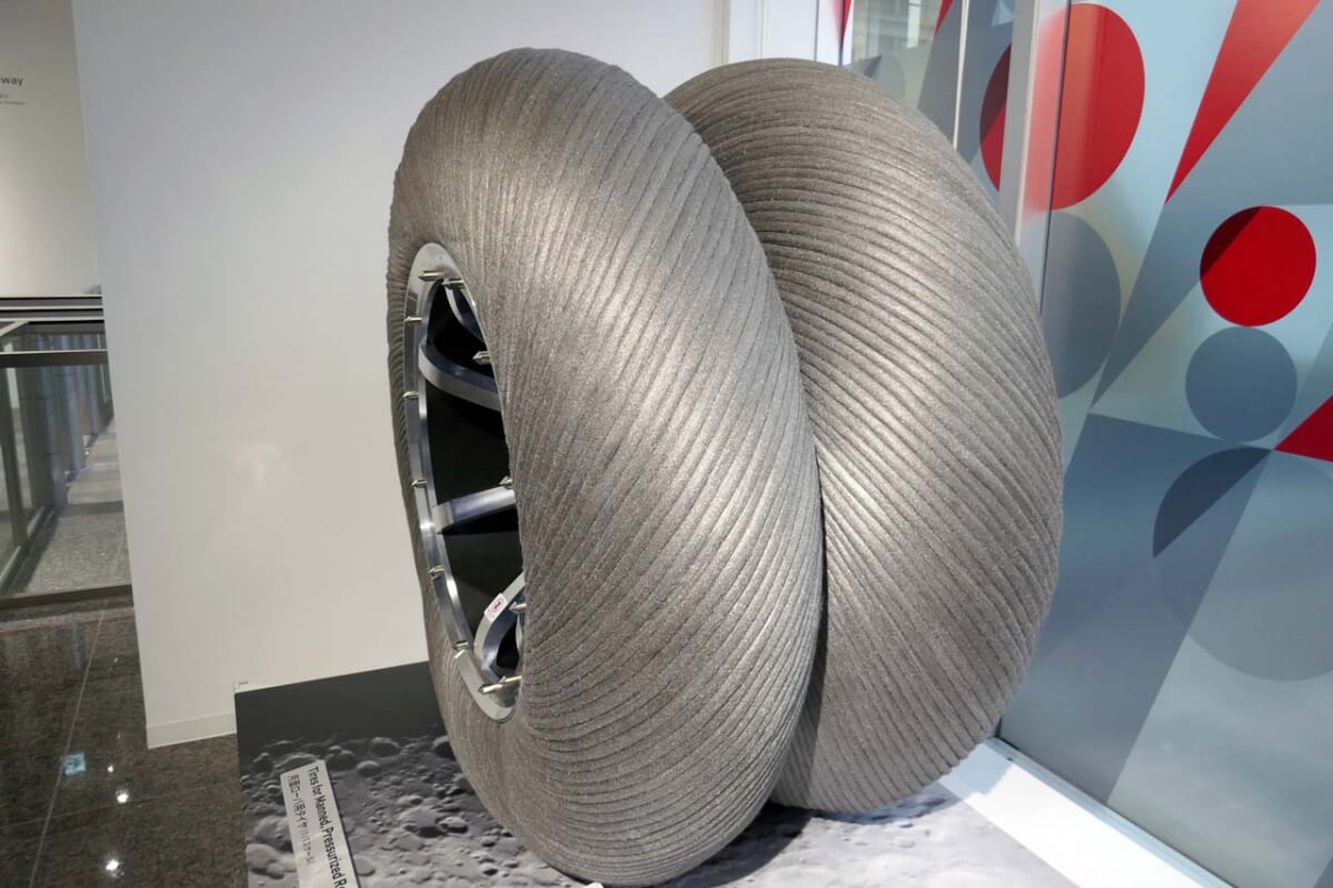 ここは未来を感じさせてくれるコーナーです。映像が流れる通路を通過するとそこはブリヂストンが描く未来を感じ取れる世界。同社が誇る最新テクノロジーが紹介されていました。なかでも興味深かったのは、JAXAとトヨタが開発中の月面探査車(ローバー)用のタイヤの展示です。注目は金属で織り込んだ特殊な素材が使われていること。月面温度は昼夜の寒暖差が280度もあり、とてもゴム製タイヤでは対応できないとのこと。重量は1本300kgもあるとのことですが、重力は地球の1/6になるため50kg相当になるんだとか。展示からはそんな月面で活躍するローバーの姿が目に浮かんでくるようです。