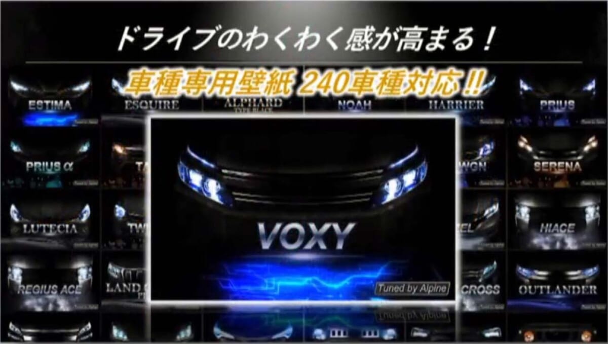 そしてアルパインならではのカスタマイズ化も大きな魅力です。車種別の壁紙データをインストールすることで、起動時にはオリジナルの壁紙を表示させることができるようになるのです。その数は240車種にも及び、それぞれの車種のヘッドライトとフロントグリルのシルエット写真に車名のタイトルが入ります。ここまでこだわってやり抜くのは今やアルパインだけ。ここにこそアルパインならではの魅力があると言えるでしょう。
