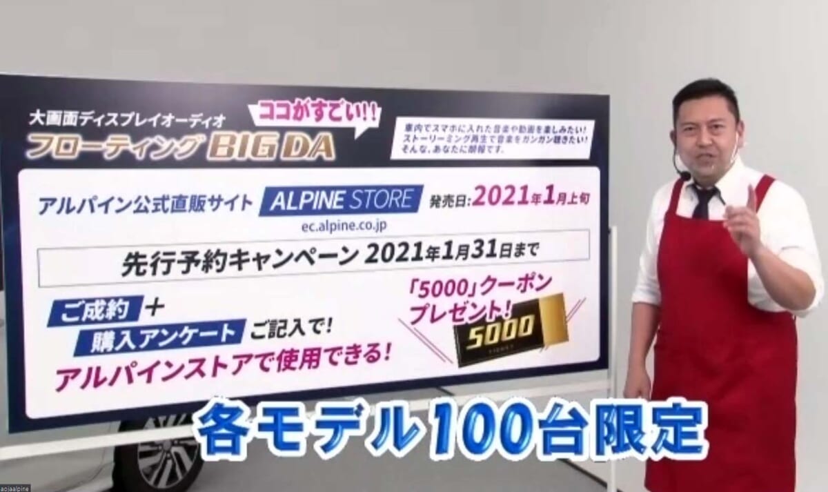 最後は司会進行役であったボス水野氏がアルパインストアでの販売価格を発表。発売記念として、オプションとのセットパッケージで1万円引きされることも実演販売さながらの軽快な口調で紹介しました。さらに「サプライズ」の先行予約キャンペーン(2021年1月31日まで)として、3タイプ各100台については、購入後に5000円(税込)クーポンがプレゼントされることも紹介され、オンライン発表会は終了しました。