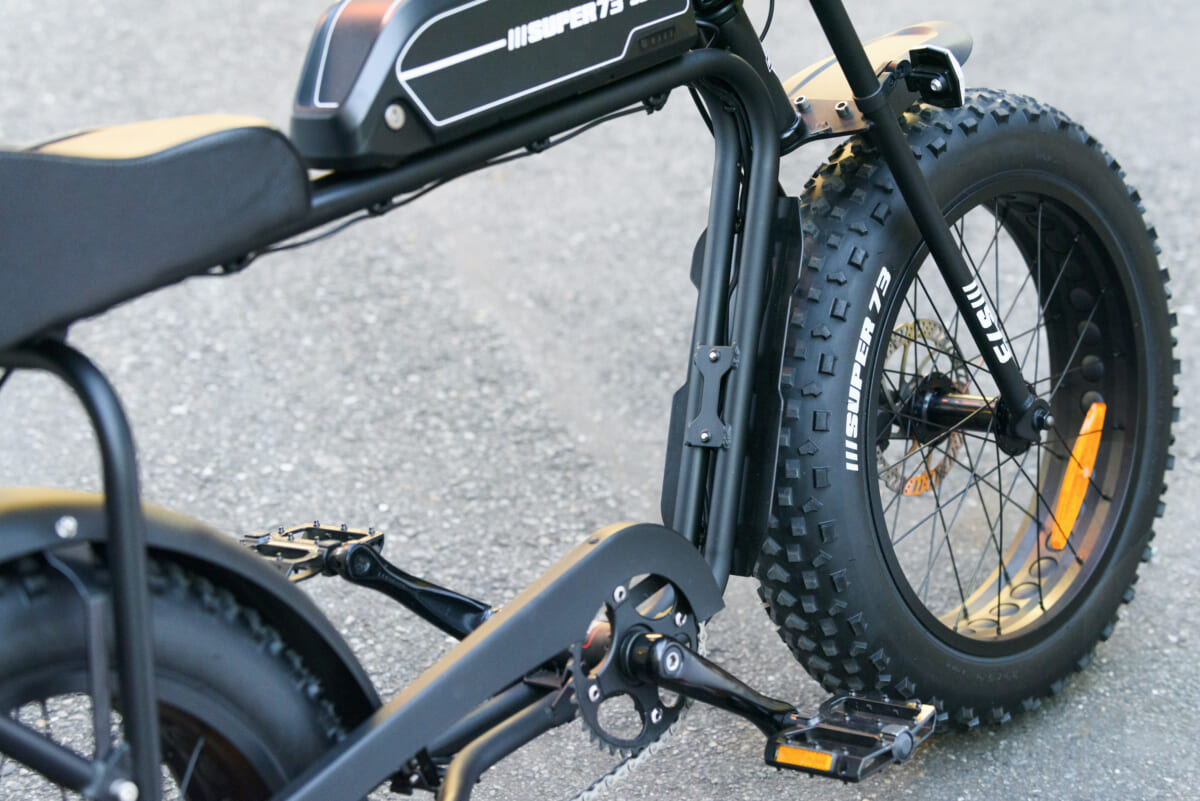 太いタイヤのほか、大きめのライト、ガソリンタンクの位置に装備されたバッテリーなど、SUPER73 SG1の見た目は完全にバイクです。それもそのはず、アメリカではSUPER73は“電動バイク”として売られているとのこと。現地仕様のものは、右手側にスロットルがあり、それを回すことでも走行できるようです。しかし、SG1は日本向けに電動アシスト自転車として売られているので、スロットルはなく、時速24kmでアシストが切れるなど、日本の法規に適合した仕様となっています。