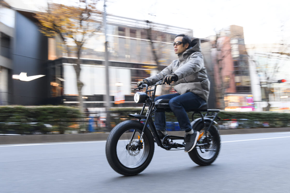 32kgという車体に太めのタイヤで、ちょっと重そうなSUPER73 SG1ですが、走行性能はどうなのか? 実際に街中を中心に走り回ってみました。またがってみると、着座位置は思ったより低く、ハンドルが高めの位置にあるので、バイクでいうとチョッパーというかボバー的なライディングポジションになります。身長175cmの筆者の場合、ペダルを回すときに結構ヒザが曲がる感じ。シートが後ろの方にあるので、ペダルに体重はかけにくい感じでした。