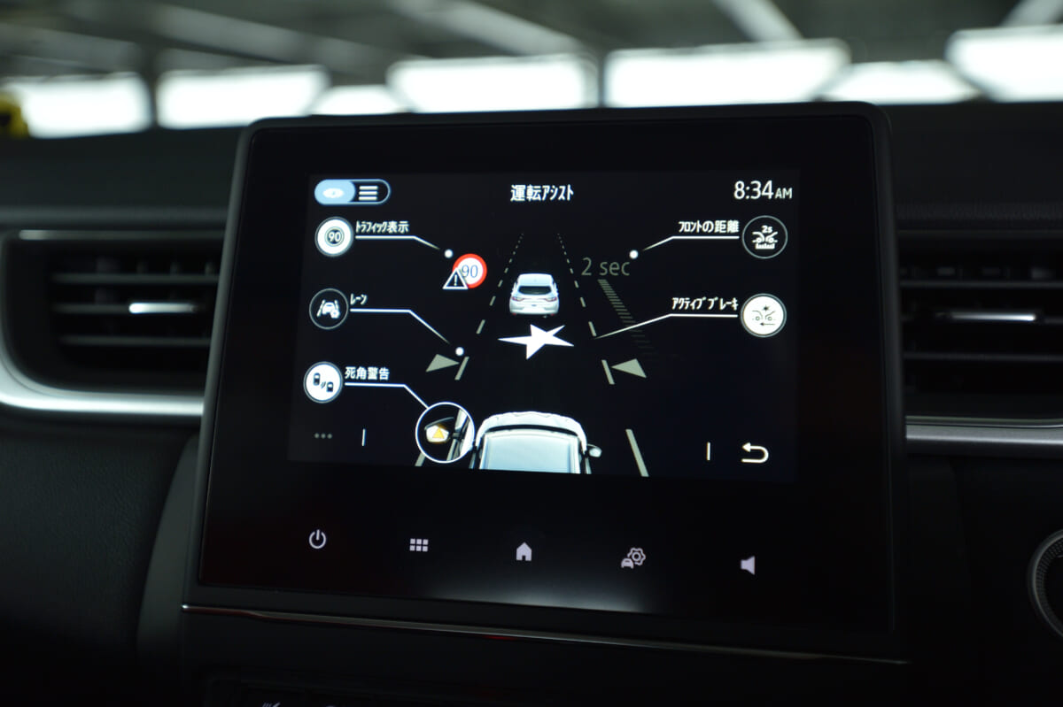 次は、最近のクルマでは欠かせない先進安全技術面を掘り下げていこう。新型ルノー キャプチャーでは最新装備をカバー。代表的なものでいえば、アダプティブクルーズコントロール、歩行者・自転車対応の衝突被害軽減ブレーキ、360°カメラ、後側方車両検知、車線逸脱防止支援、車線逸脱警報、交通標識認識機能。インテンス テックパックにはさらに、レーンセンタリングアシストを装備し、車線の中央をキープしてくれる。