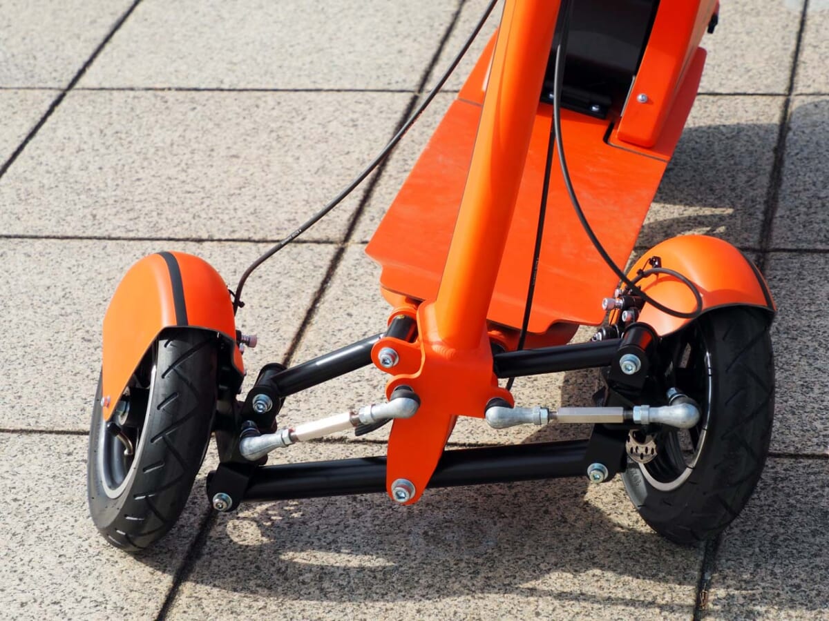 特に感動したのがカーブを曲がった時の前輪の吸い付き感です。これが愛らしい姿からは想像できないアクティブな走りを生み出していたのです。実はGOGO!の前輪には、井原氏がカーレースで体験した技術をフィードバックして完成させたマルチリーンサスペンションが採用されています。これが安定したコーナリングに結びついていたのです。