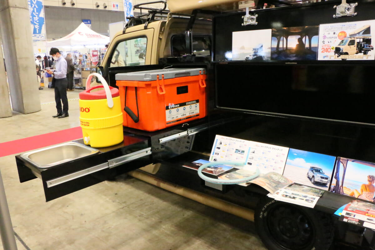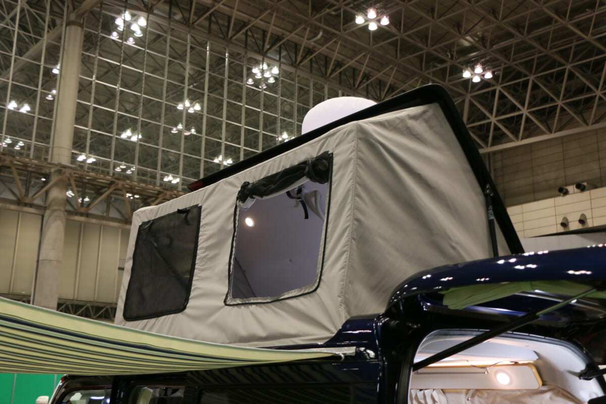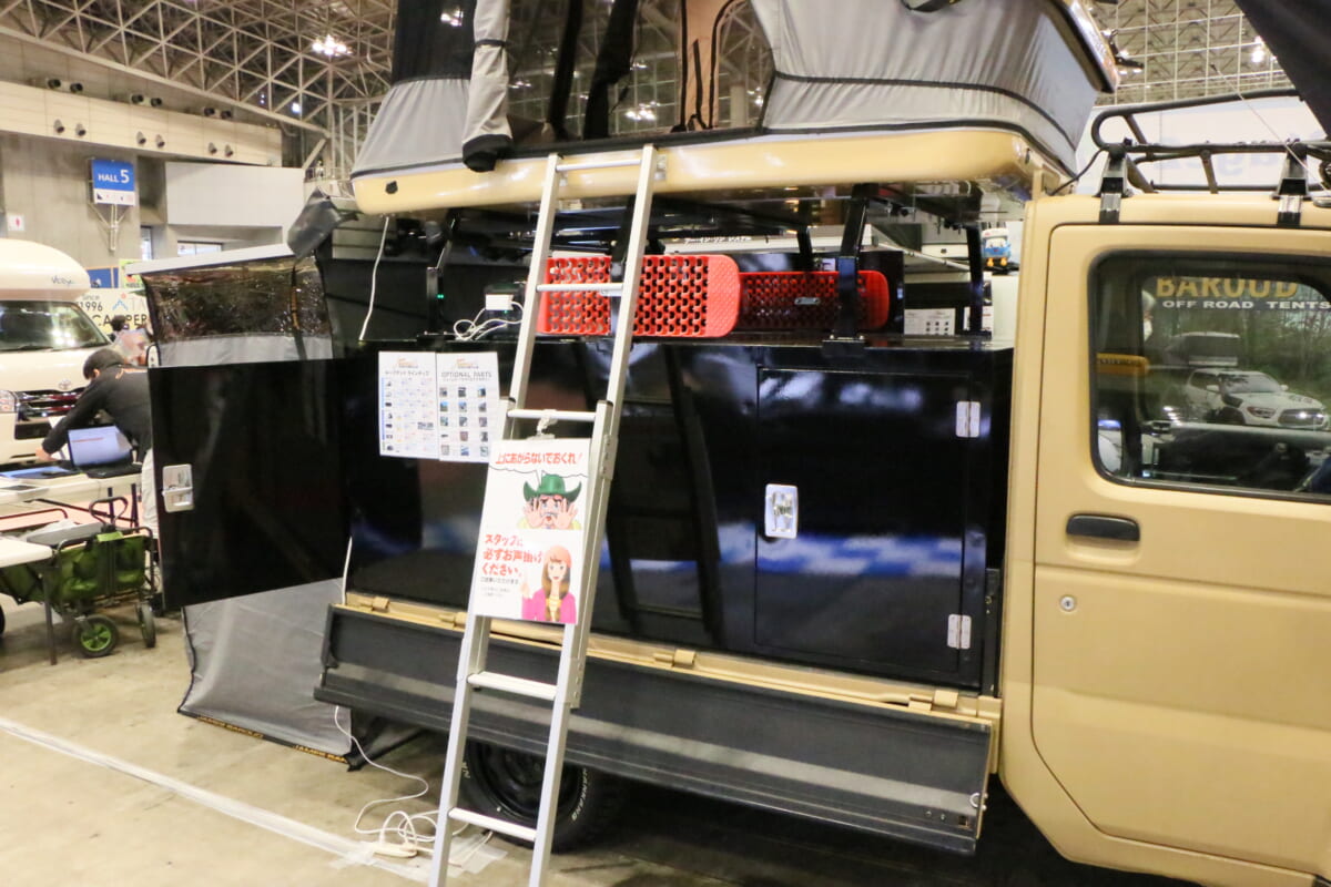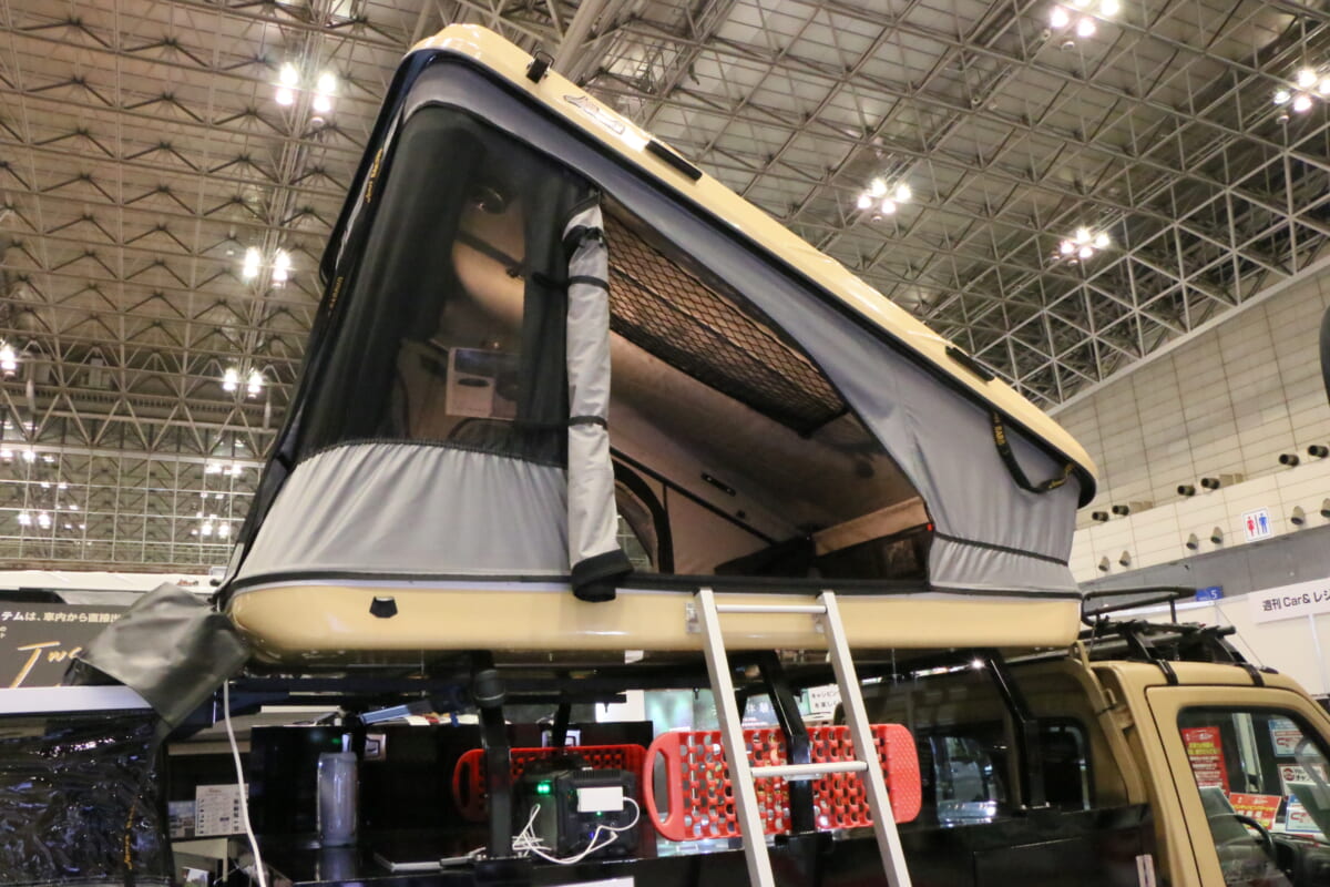 スズキの「キャリイ」をベースに、フォード「F-150ラプター」をイメージしたフロントフェイスキット(16万2800円)を組み込み、4インチのリフトアップをするなど大きくイメージを変えたモデル。荷台に設置されるのはキャビンではなく「DEPLOY BOX」(74万8000円)というキャンプ道具などの収納ボックスで、その上にハードシェルタイプのルーフテント(44万8800円)を装備しています。泊まれるだけでなく、アウトドアで遊べるように仕上がったこのモデルは、乗り出し価格240万円で販売されていました。