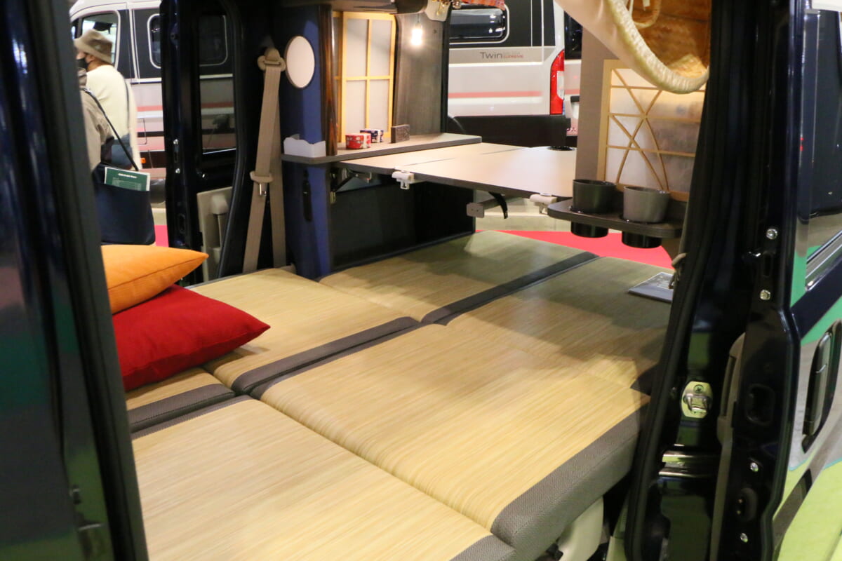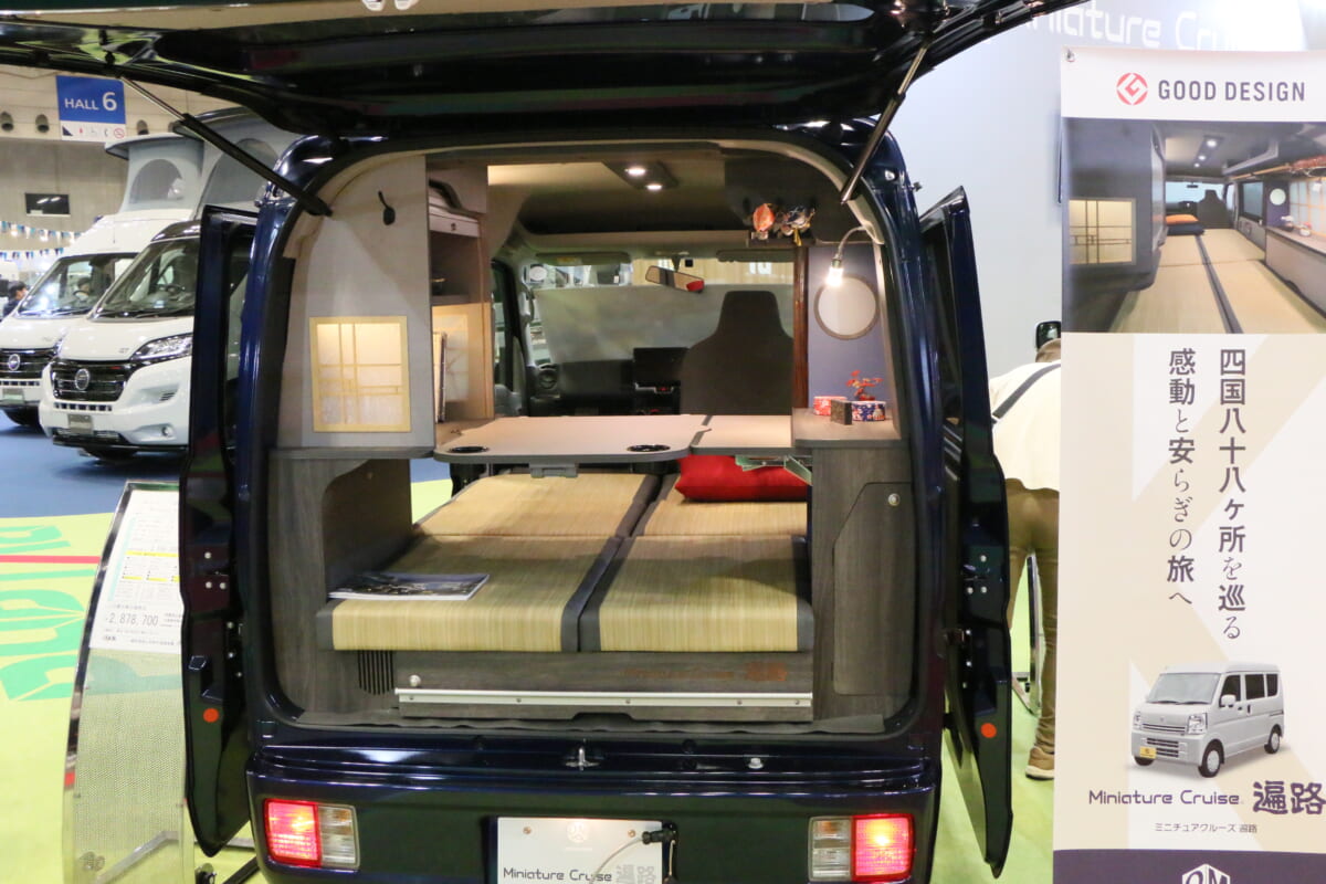 同じくスズキ「エブリイ」をベースにユニークな和風の内装に仕上がっている点に注目。リアシートを倒した空間に、畳を表皮に用いたマットを敷き詰め、フラットな空間を作り出しています。サイドの棚部分にも障子を設置し、カーテンも和風の素材を使うなど、細部まで徹底した作り込み。105Ahのサブバッテリーやエアコンも標準装備し、快適性能も忘れていません。価格は259万9300円〜で、ソーラーパネルなどのオプションを装備した展示車の価格は287万8700円。