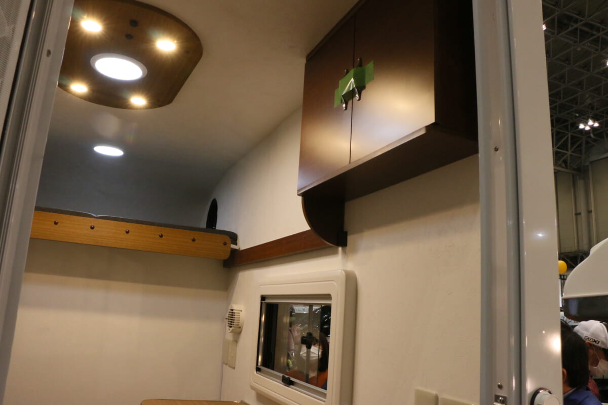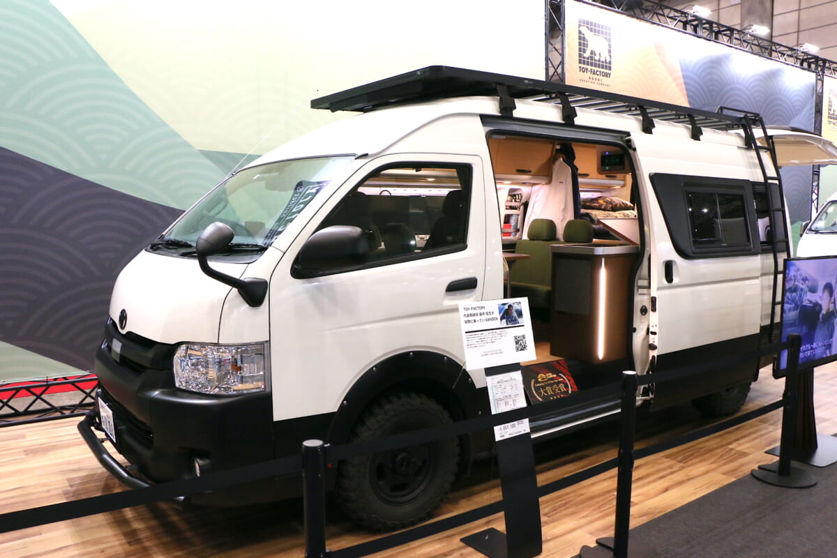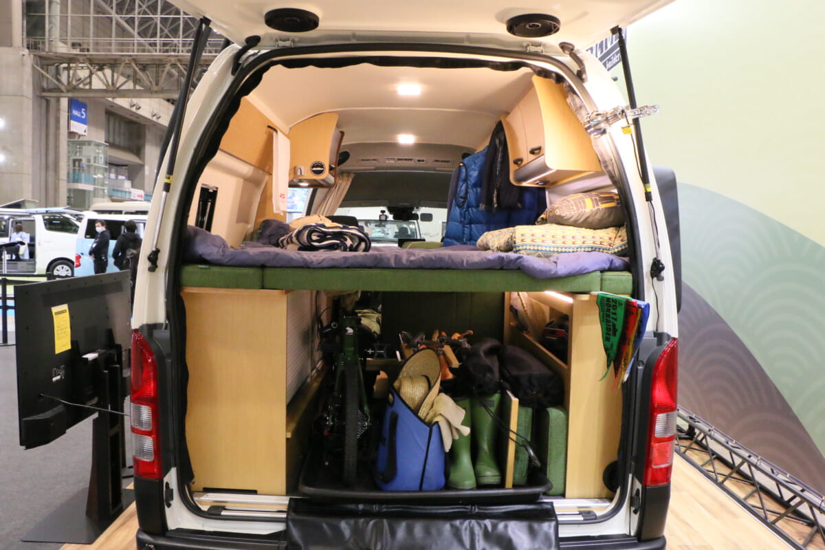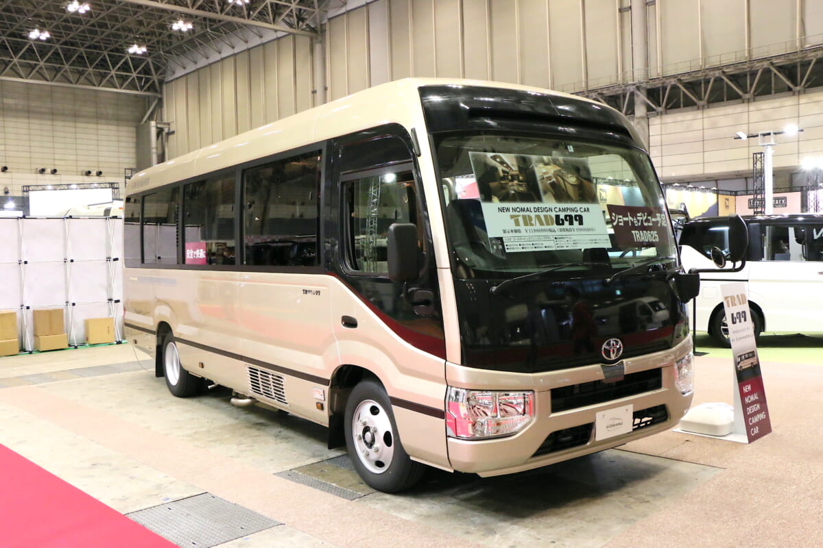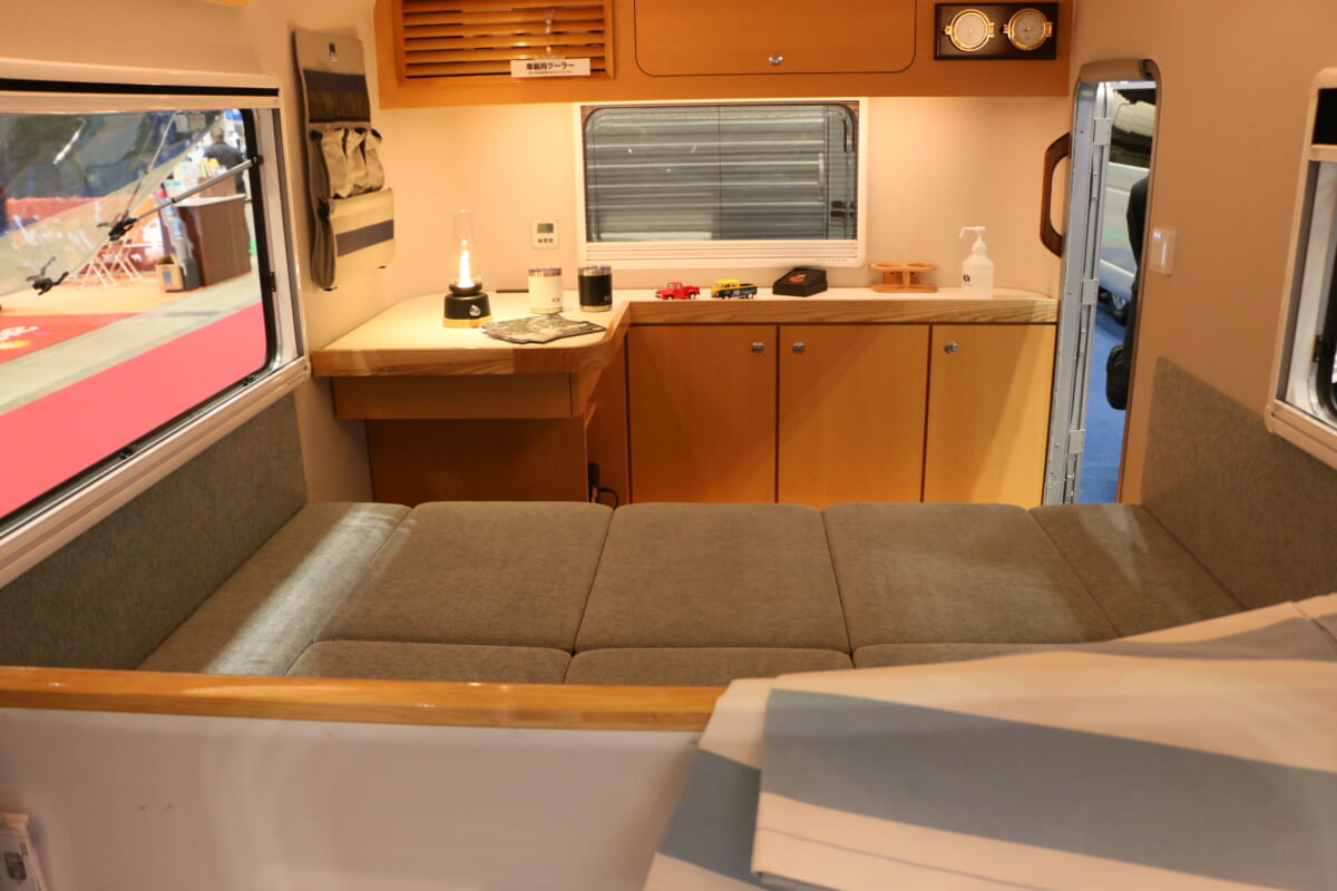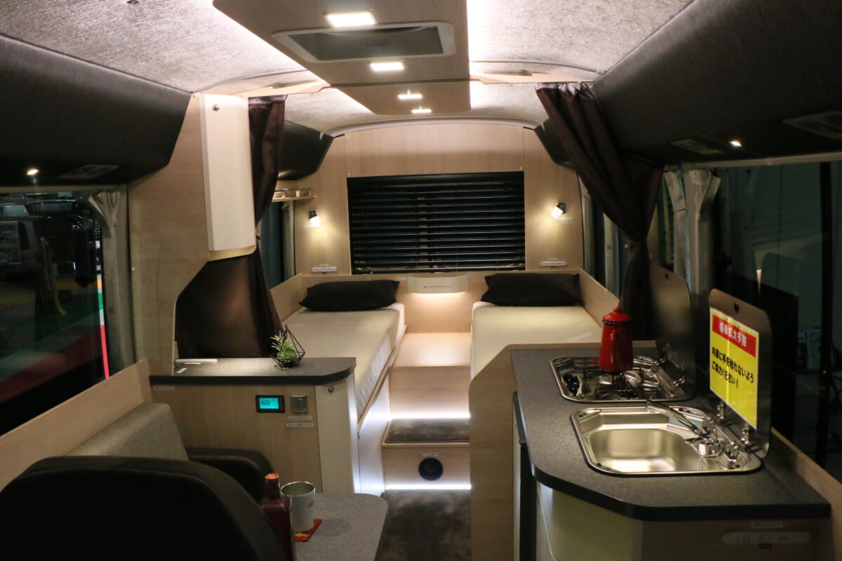 トヨタのマイクロバス「コースター」をベースに、内装をキャンパー仕様としたモデル。キャビンの奥には2つの常設ベッドを備えるほか、リビングスペースもベッド展開が可能で大人3人が就寝できます。それでいて、9人が乗車可能なように前向きの座席も残しており、窓も塞がずに運転もしやすいように配慮。3世代の家族で出掛けて、若い世代は外でキャンプするような使い方を想定しているとのことです。価格は1188万円。
