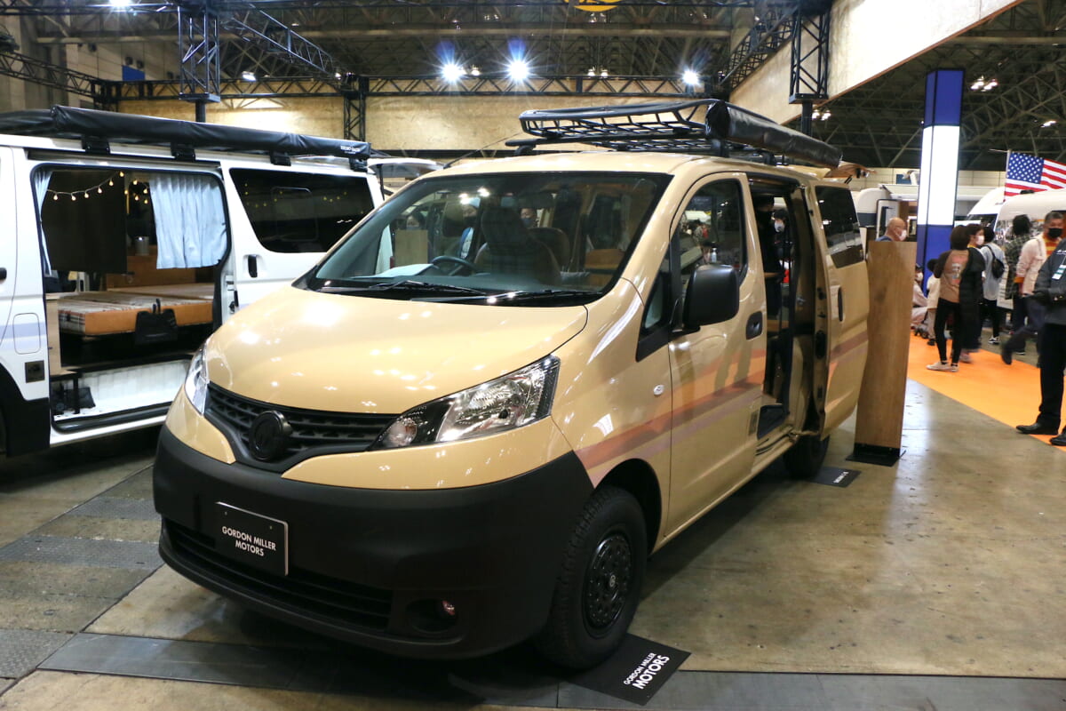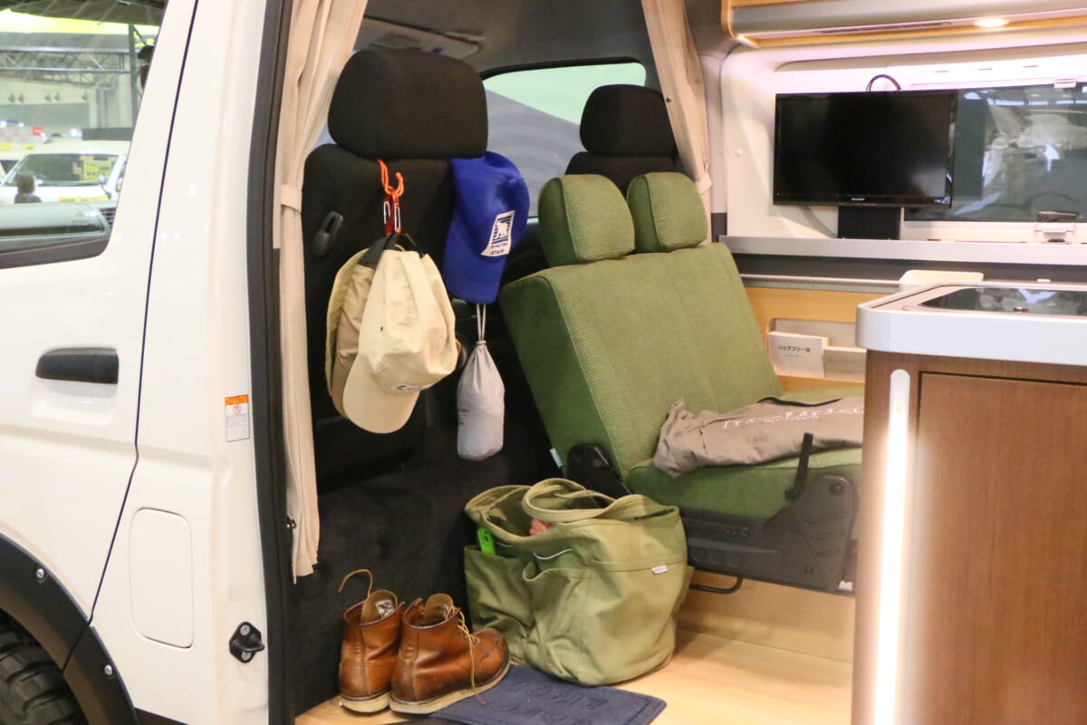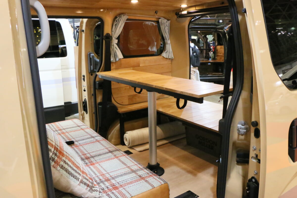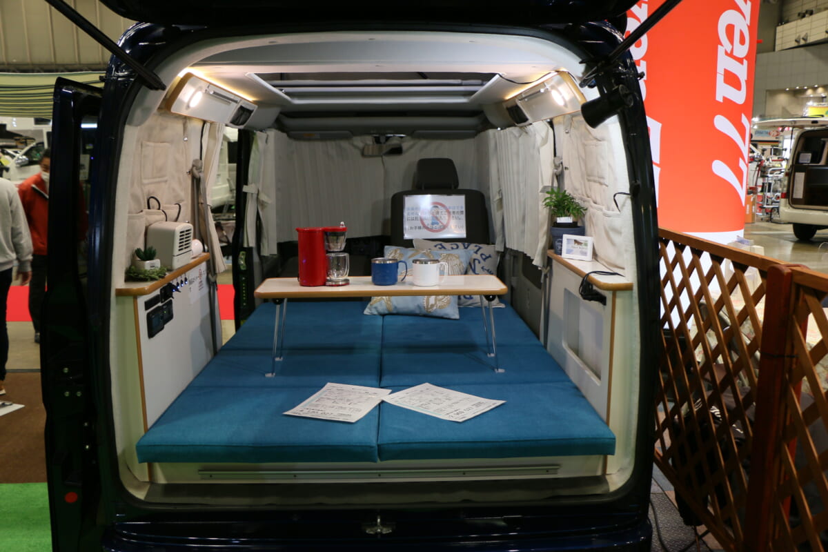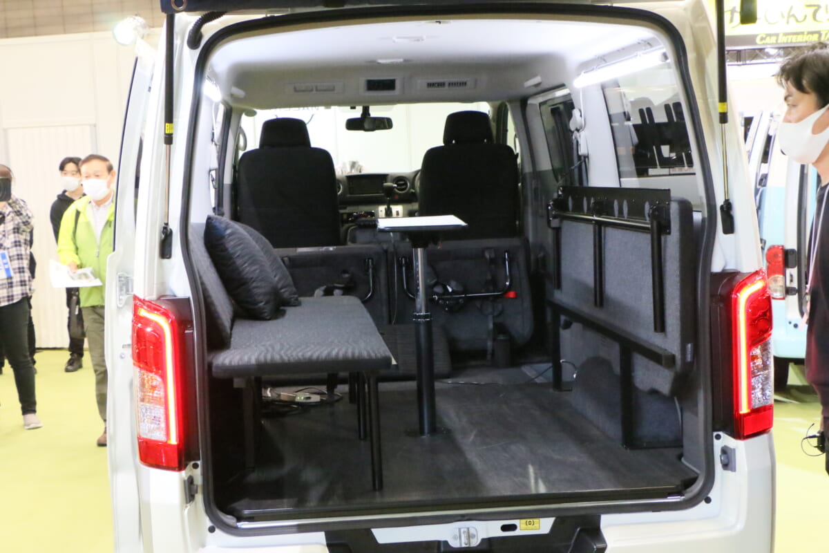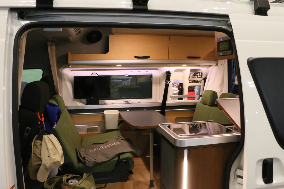 トヨタのマイクロバス「コースター」をベースに、内装をキャンパー仕様としたモデル。キャビンの奥には2つの常設ベッドを備えるほか、リビングスペースもベッド展開が可能で大人3人が就寝できます。それでいて、9人が乗車可能なように前向きの座席も残しており、窓も塞がずに運転もしやすいように配慮。3世代の家族で出掛けて、若い世代は外でキャンプするような使い方を想定しているとのことです。価格は1188万円。