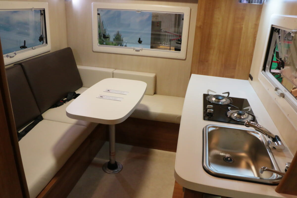 キャブコンのビルダーとして幅広いモデルを展開しているVANTECH(バンテック)が新たにリリースしたのが「CORDE RUNDY(コルドランディ)」。リビングスペースは1860×1390mmの広大なベッドスペースに展開可能なほか、エントランスの床部分には防水加工を施し、汚れたら水洗いが可能です。アウトドアアクティビティを楽しみたい人や、ペット連れで旅をする人にはありがたい装備。運転席上のロフトベッドは左右に振り分けたツインタイプとなっているのも新しい提案です。価格は765万3000円。