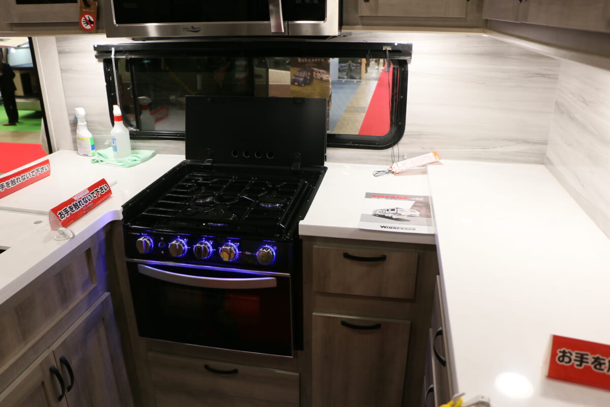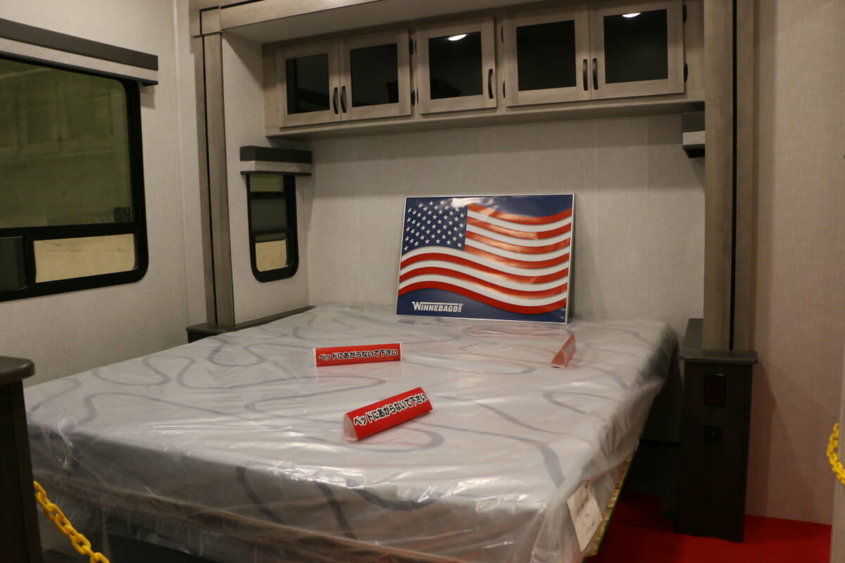 全長11.95mというサイズに驚く巨大トレーラー。フロントリビング部分などは引き出すように左右のスペースが拡大可能で、内装も移動可能とは思えないほど豪華な作りです。エアコンや温水シャワーはもちろん、ガス式の温水装置やヒーターなども備え、快適な居住が可能。キングサイズのベッド(オプション。標準はクイーンサイズ)や広いキッチンもあり、完全に“住める”装備で、価格も1232万円〜と家並みとなっています。