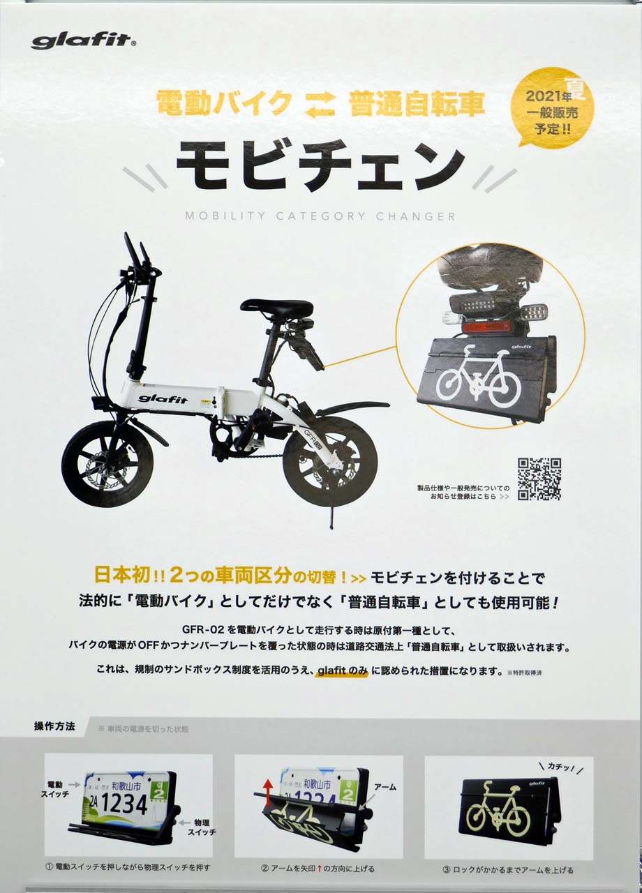 そんな状況の中、販売済みのGFR-01のユーザーからは、「バッテリーが切れた時はせめて自転車道を走らせて欲しい」といった声が多く寄せられ、glafitでは新型車GFR-02の発売に合わせて国のサンドボックス制度による解釈の変更を要望したのです。その結果、専用の機構でナンバーを隠している時は自転車として扱われる特例を獲得。モビチェンの発売に合わせて全国の都道府県警に通達が出される運びとなっていました。
