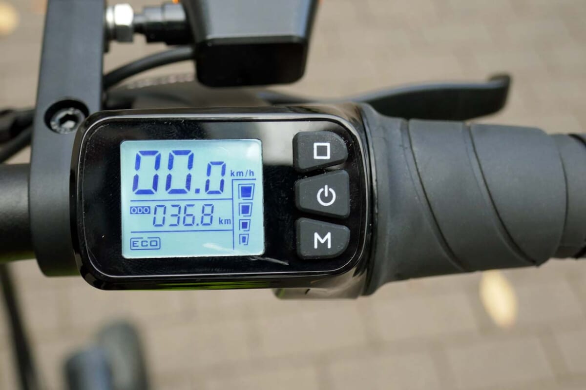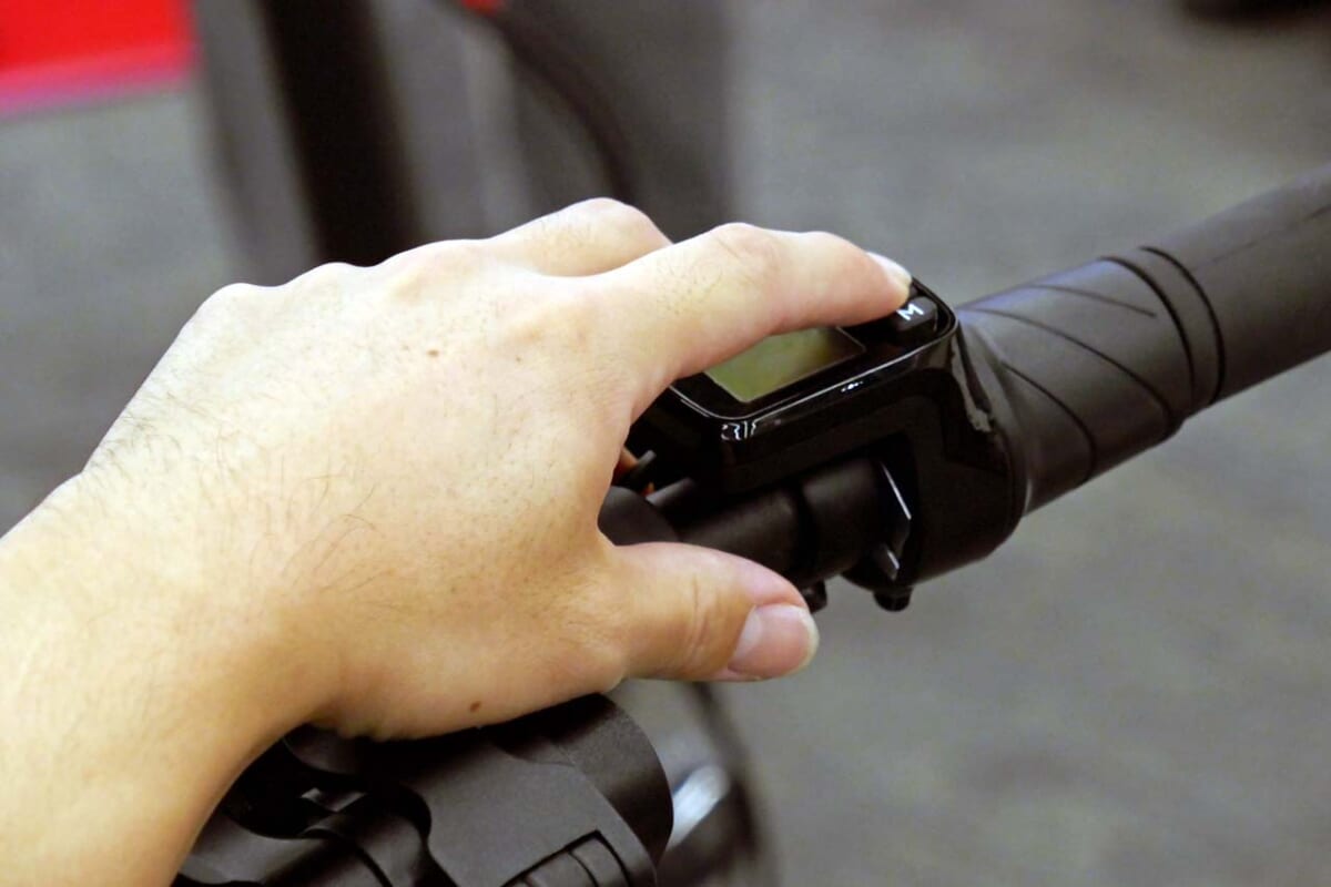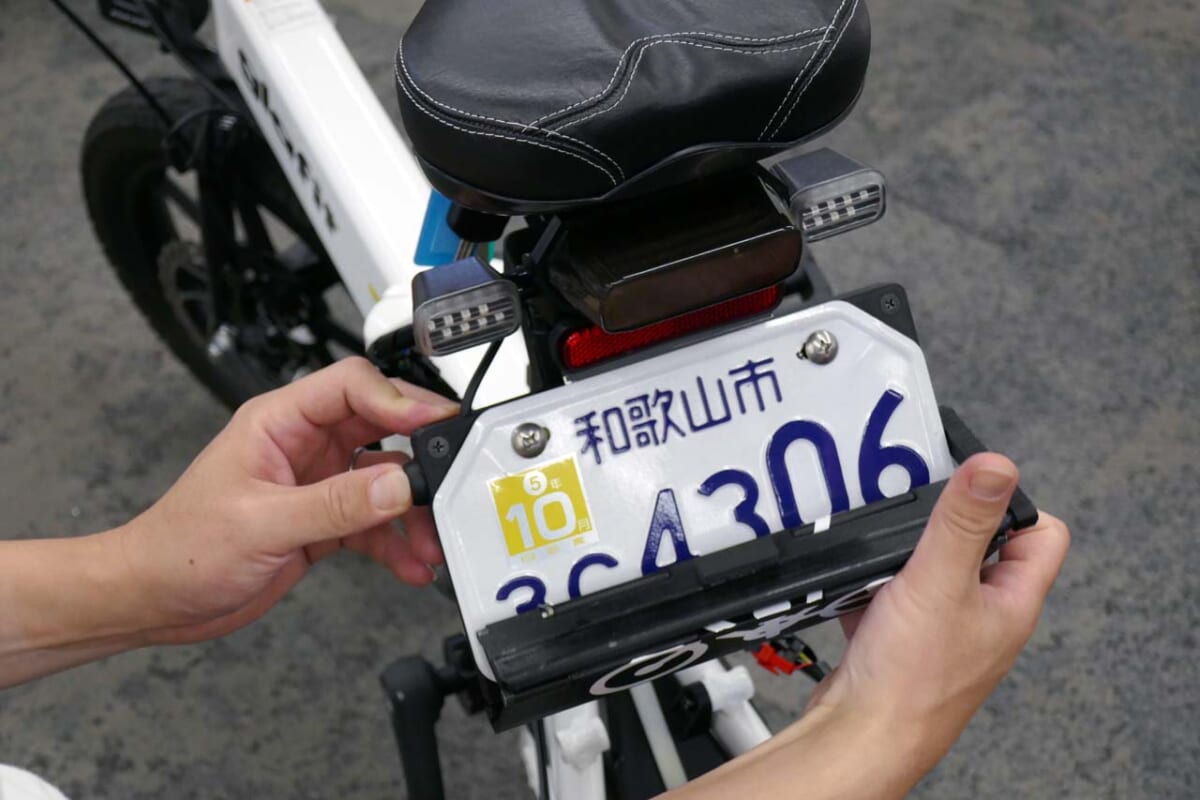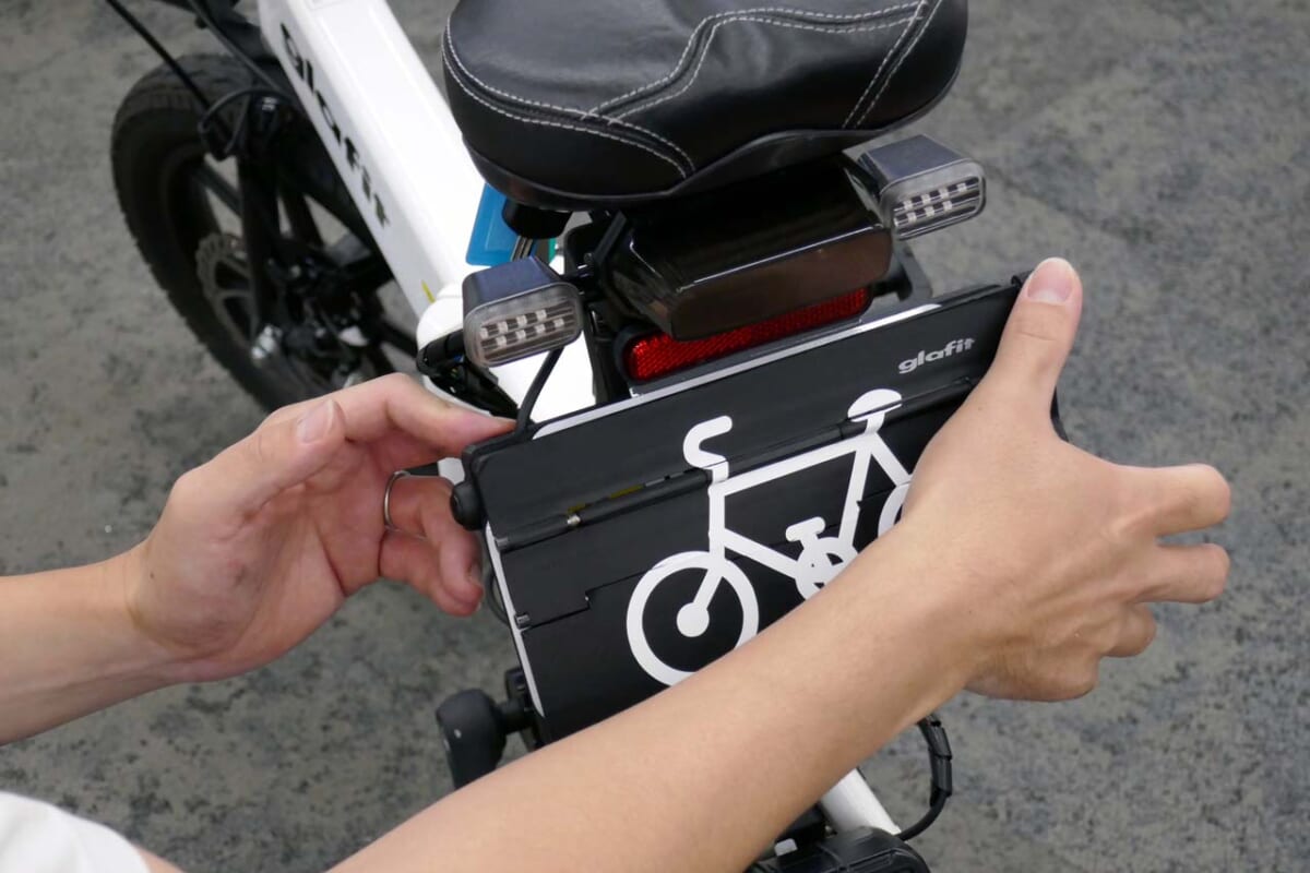 ナンバープレートを隠す操作は、まず車両を停止させて電源をOFFにすることから始めます。ナンバーに向かって左側のボタンを押すとモビチェンの電源が入りますから、次に右側のレバーをロックがかかるまで上げます。これでナンバーがモビチェンで隠され、ここからGFR-02はモーターを使わない自転車として乗ることができるようになるのです。