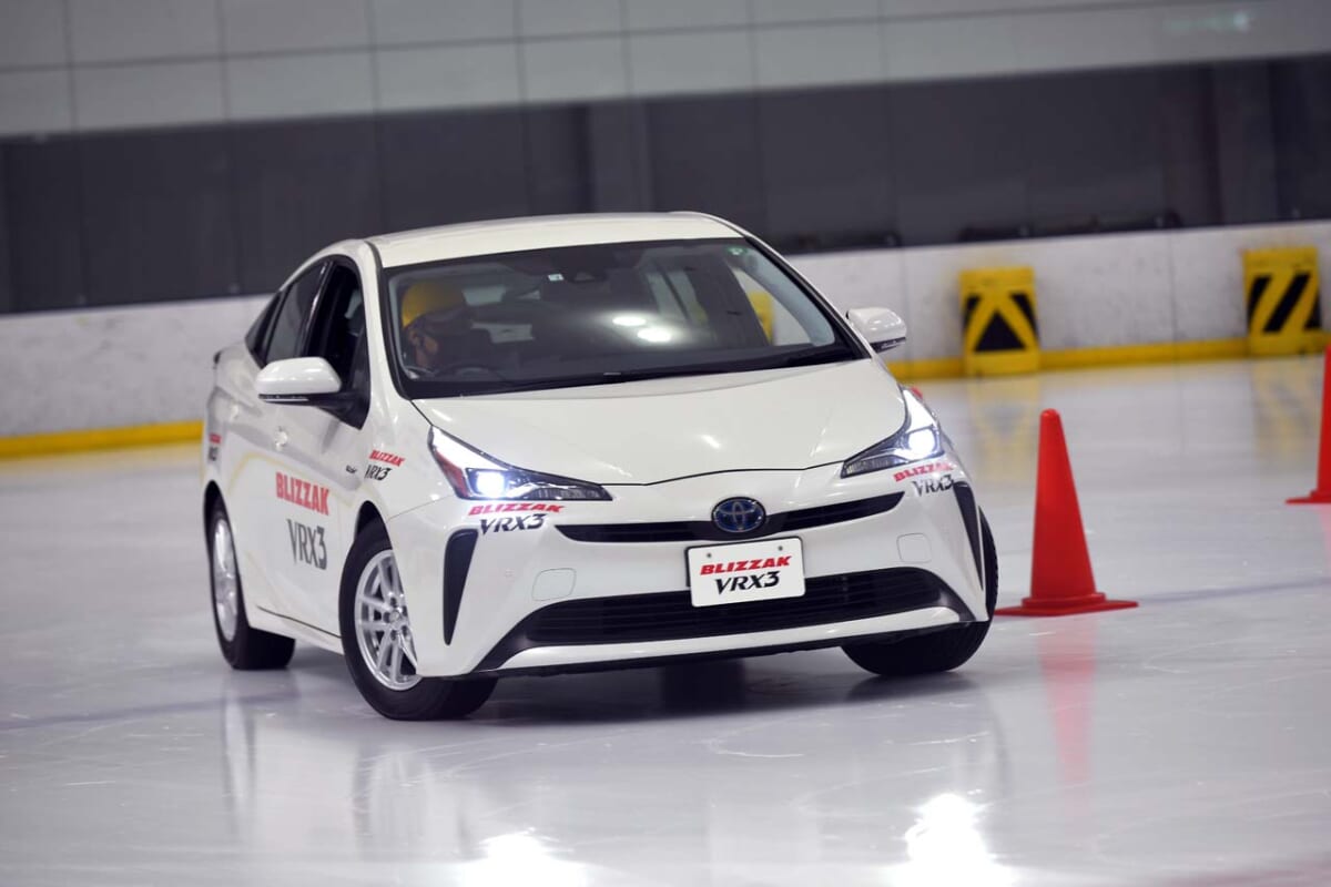 では、これらを装備したVRX3の実力はどうなのか。体験したのは横浜市にある新横浜スケートセンターです。試乗車は現行プリウス2台。前モデルであるVRX2と比較しながらの体験となりました。スケートセンター内ということもあり、速度域は最高で15km/hまでで、メニューは主に直線での発進とブレーキング時のグリップ力と、コーナーでの横方向への滑りの体験。実際に走行してその違いを感じ取ることにしました。