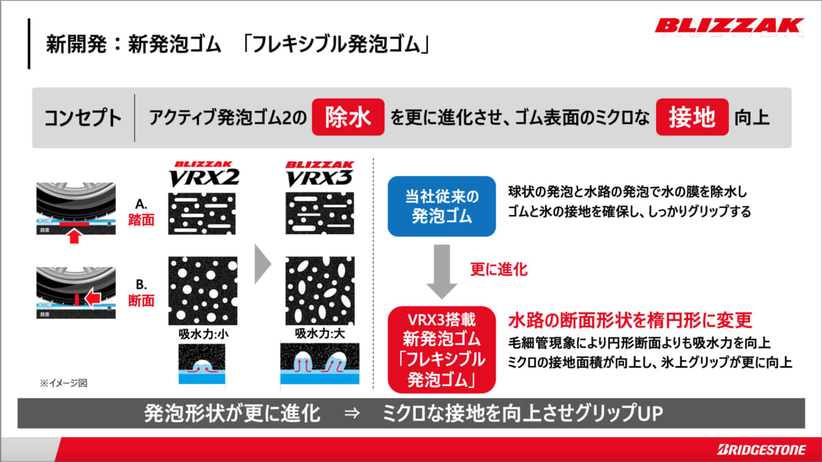 さて、そうした日本の環境に向けて誕生したVRX3ですが、氷上での効果を発揮するためにまず実施しているのは水の除去(除水)です。水を可能な限り取り除くことで、滑りの要因を低減。次に路面にしっかりと接地させて摩擦・ひっかきを働かせることでグリップ力を高めます。ただ、これらは従来製品でも実施してきたことでもあります。今回はその性能を進化させるために新たな素材として、新タイプの発泡ゴム「フレキシブル発泡ゴム」を採用。これが除水性能と接地性の向上に大きく寄与したと言います。