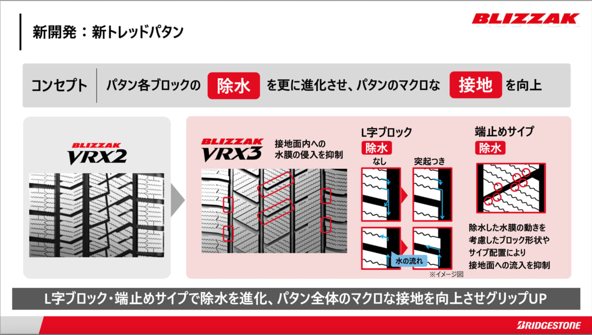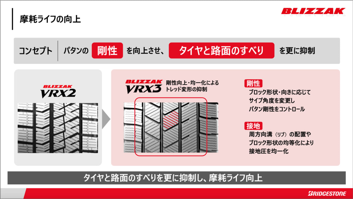 そうした実績を踏まえ、さらなる「氷上性能の大幅向上、ライフ性能、効き持ちの向上を実現した」(ブリヂストン)のがVRX3なのです。
