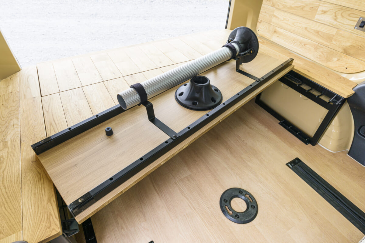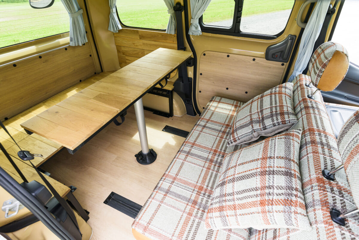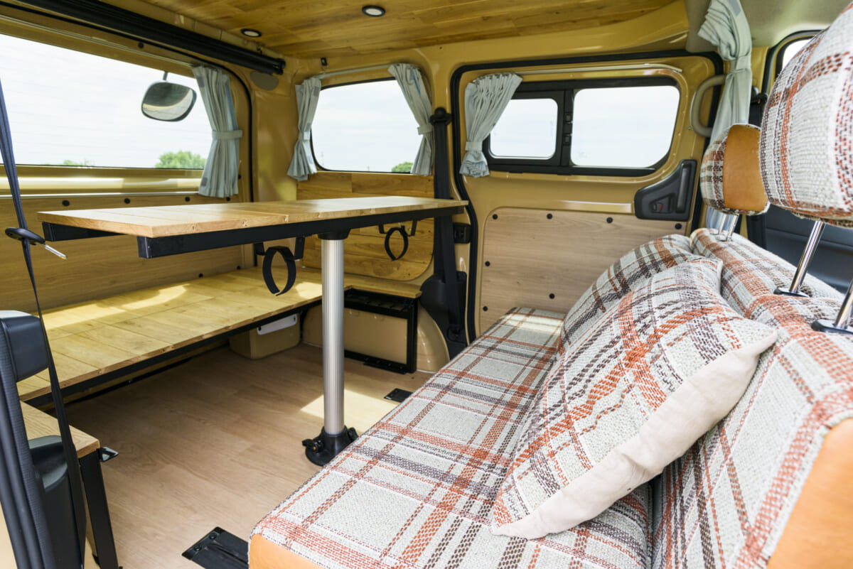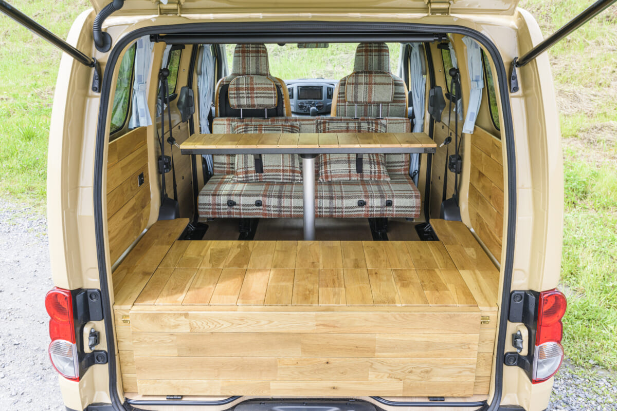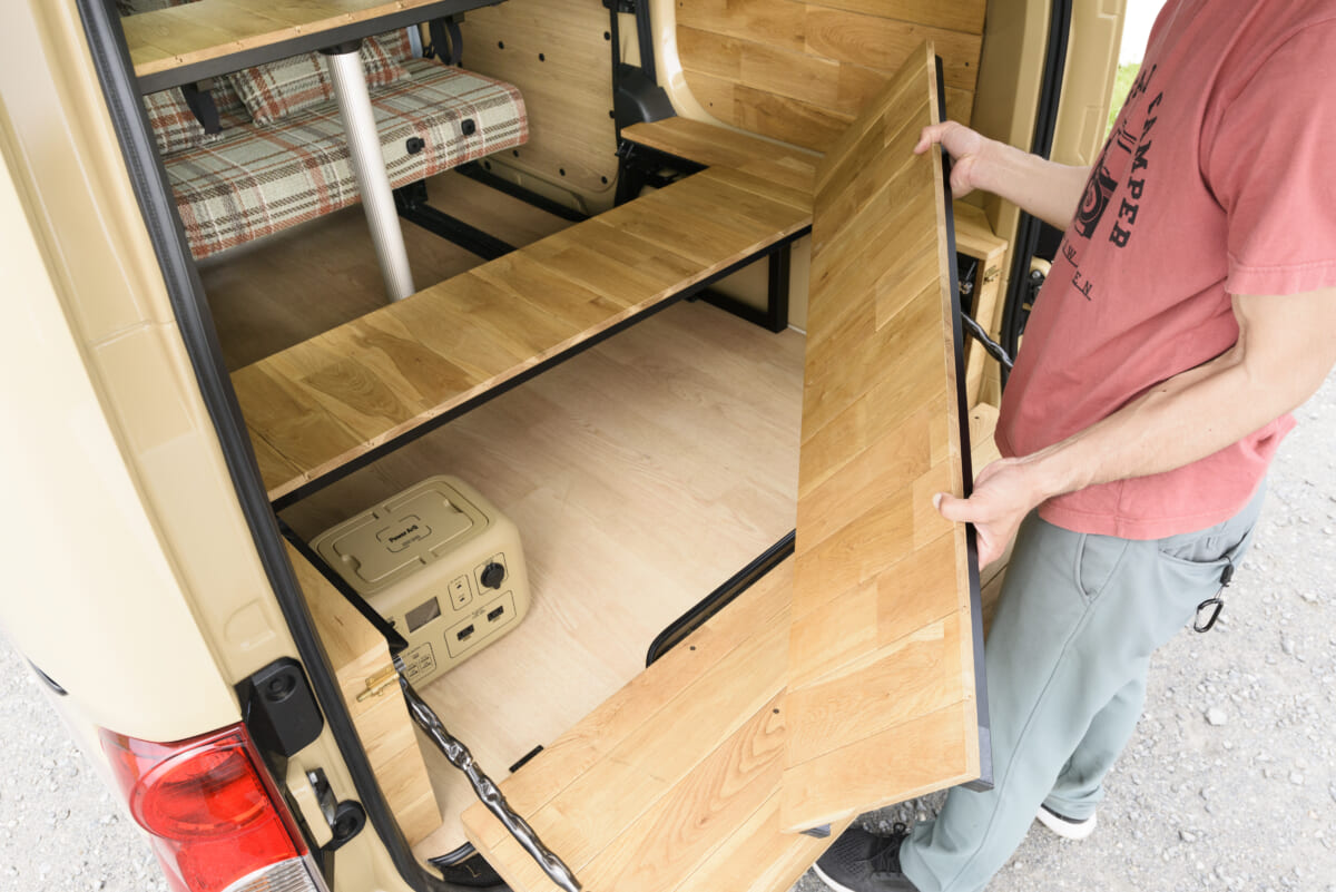 木材のパネルを組み合わせることで、フラットな就寝スペースを作り出したり、テーブルを備えたリビングに展開できるのは「GMLVAN」の基本スタイル。この機構は「GMLVAN C-01JSF」にも受け継がれています。ラゲッジ後端にはフラップ式のテーブルが追加され、より家具っぽい印象が強まりました。