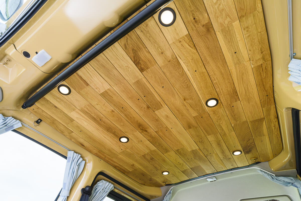 「GMLVAN」シリーズは、過剰な装備は備えず快適に車中泊できるフラットな空間が作れることと、天然木を使った車内空間が特徴。海外では「VAN LIFE」と呼ばれる、DIYで木材を内装に貼り付けたようなスタイルが人気ですが、その雰囲気をクオリティ高く再現しています。