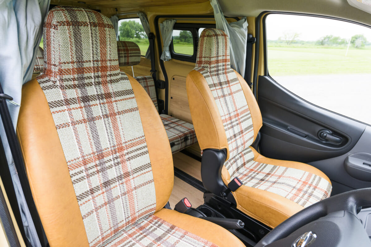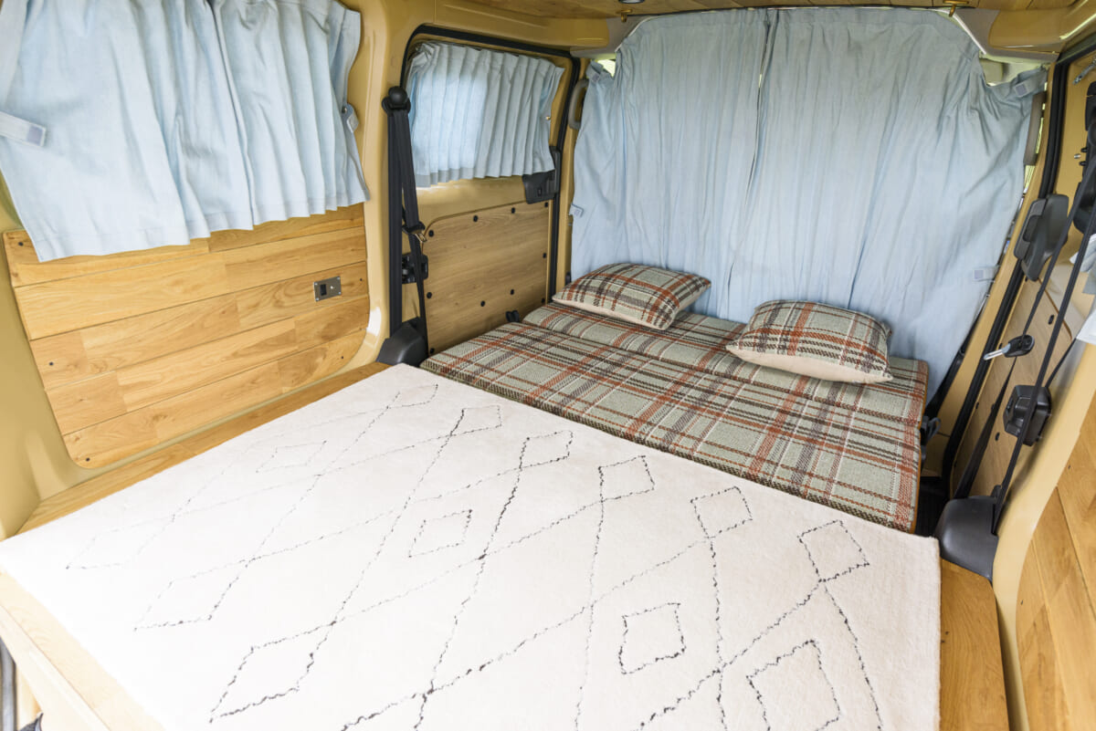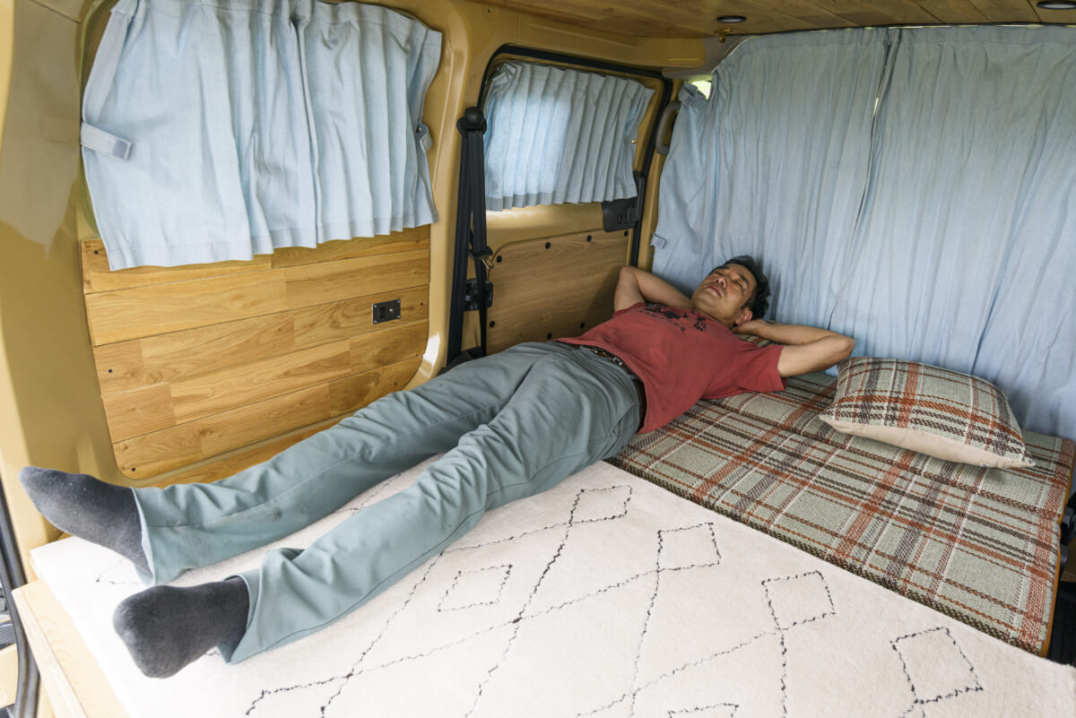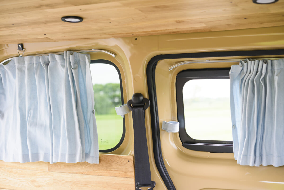 また、リアシートとパネルでフラットな空間を作れるので、寝心地もかなり快適。キャンプ用のマットや寝袋がなくても、この季節だと毛布やタオルケットを持ち込むだけで気持ち良く眠れます。実際に泊まってみましたが、日が昇るとデニム地のカーテン越しに心地よい日差しが入ってきて、気分良く目覚めることができました。眩しくないけど、外の明るさを感じられる絶妙な配色ですね。