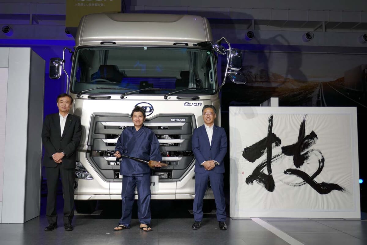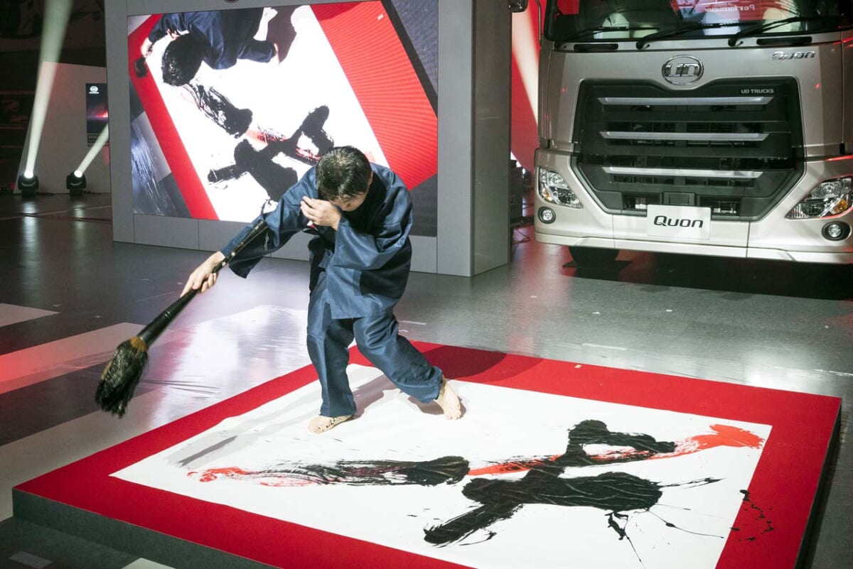 ■UDアクティブステアリングの制御精度を示すデモンストレーション。クオンのトレーラーヘッドには筒状のホルダーを介して大型の筆が取り付けられ、正確さが求められる書道に挑んだ。