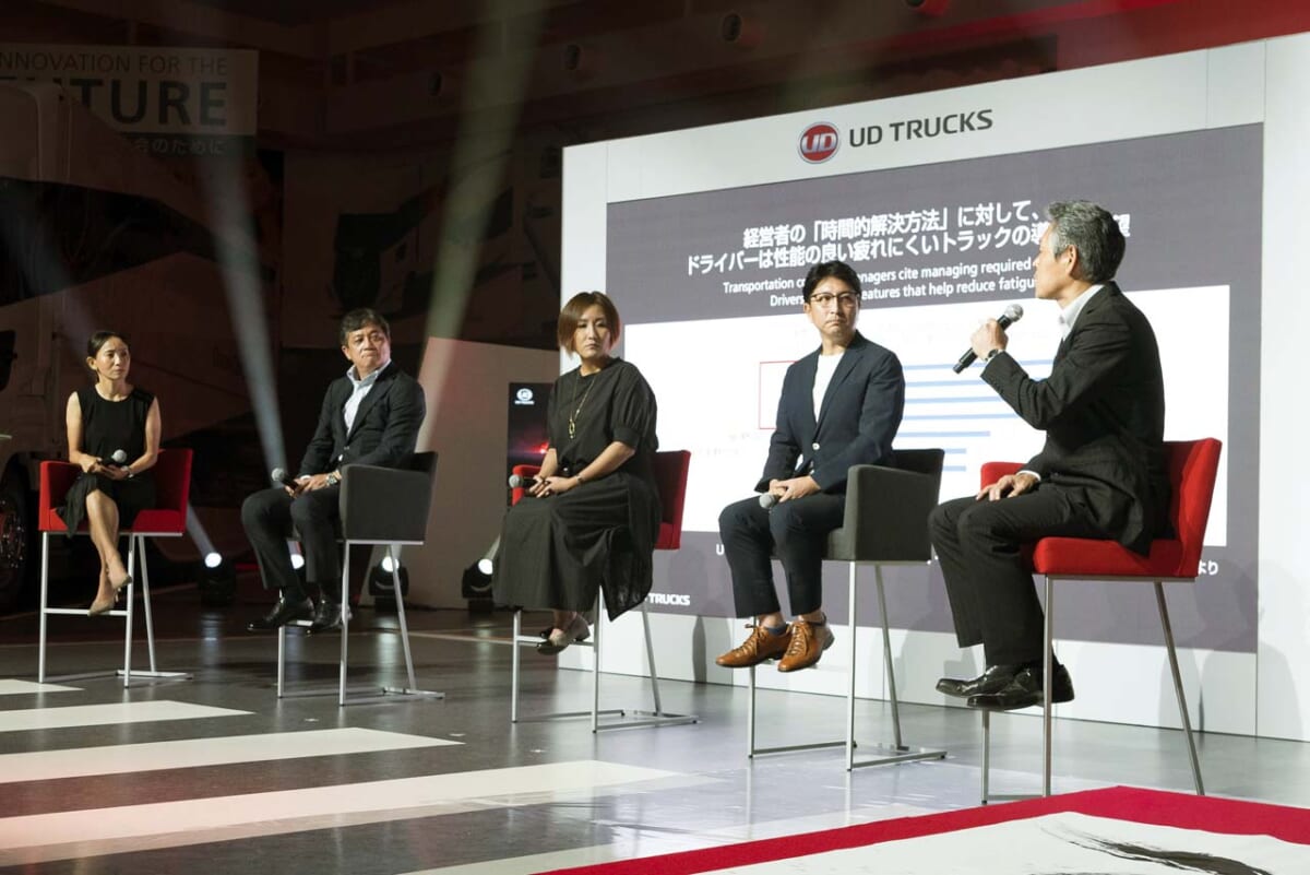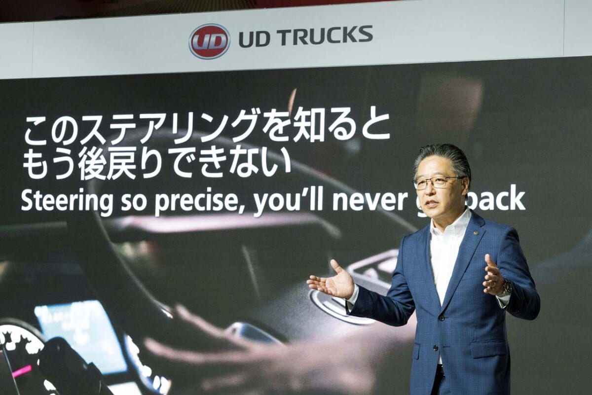 記者発表会に登壇したUDトラックス 代表取締役社長 酒巻孝光氏は、「ここ数年、ドライバーの有効求人倍率は全業種平均の約2倍と圧倒的に高く、その要因は少子高齢化、若者のクルマ離れ、給料、長時間労働や荷役作業のような体力的に過酷な労働環境など様々なことが考えられますが、UDトラックスができることはドライバーに常に寄り添ってその解決方法を常に考えること。我々は運ぶことをもっと楽に、そして豊かな気持ちで運んでもらえるよう、今後も技術力でサポートしていきたい」と語りました。