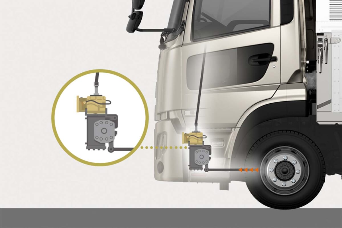 特徴的なのは、後退・右左折・旋回などの低速走行時には取り回しが軽く、速度が上がるにつれてステアリングの安定感が増していくことです。積み荷や路面状況、横風などにも左右されない安定したステアリングを実現できるため、これがドライバーにとって疲労軽減と安全に大きく貢献することにつながるというわけです。