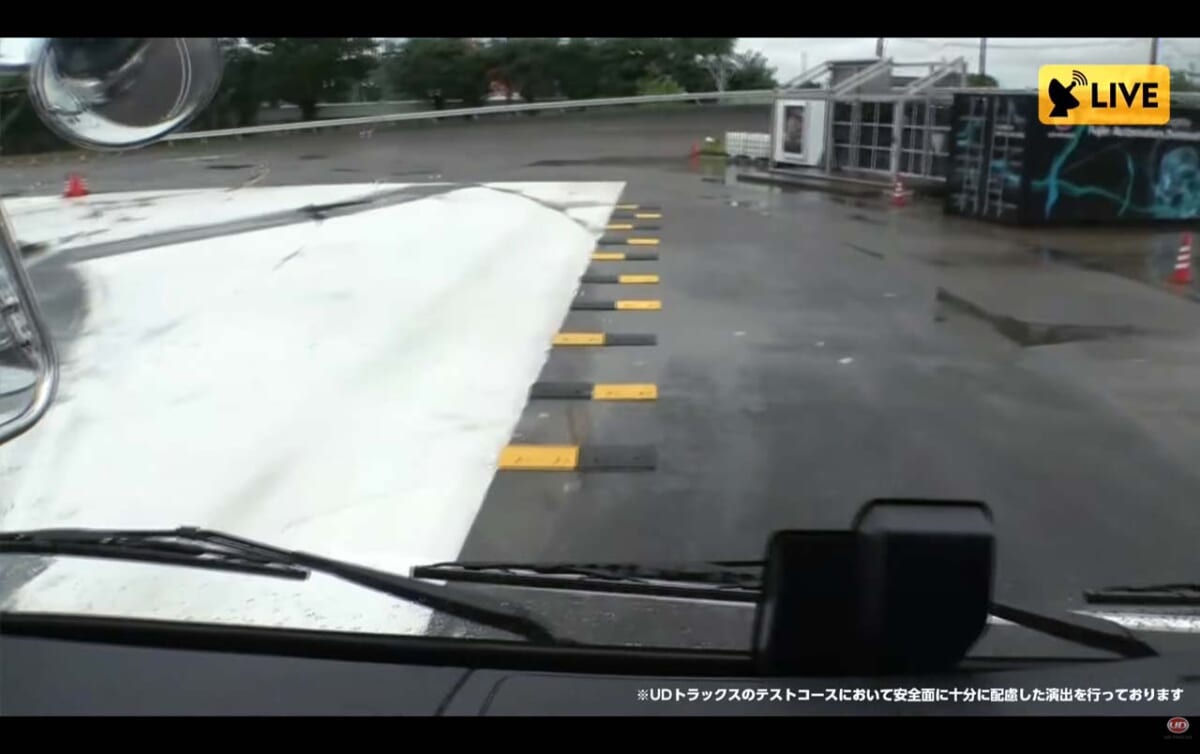 「3」では、波状路を想定した凹凸を左側の車輪で連続して乗り越える体験。本来ならこうした凹凸を乗り越えると、その度にステアリングが影響を受けて方向が定まらなくなってしまい、ドライバーはその修正を余儀なくされます。が、UDアクティブステアリングではキャビンが大きく左右に振られても、ステアリングだけはまるで目標物があるかのように真っ直ぐ進んでいったのです。これは本当に見事なものでした。