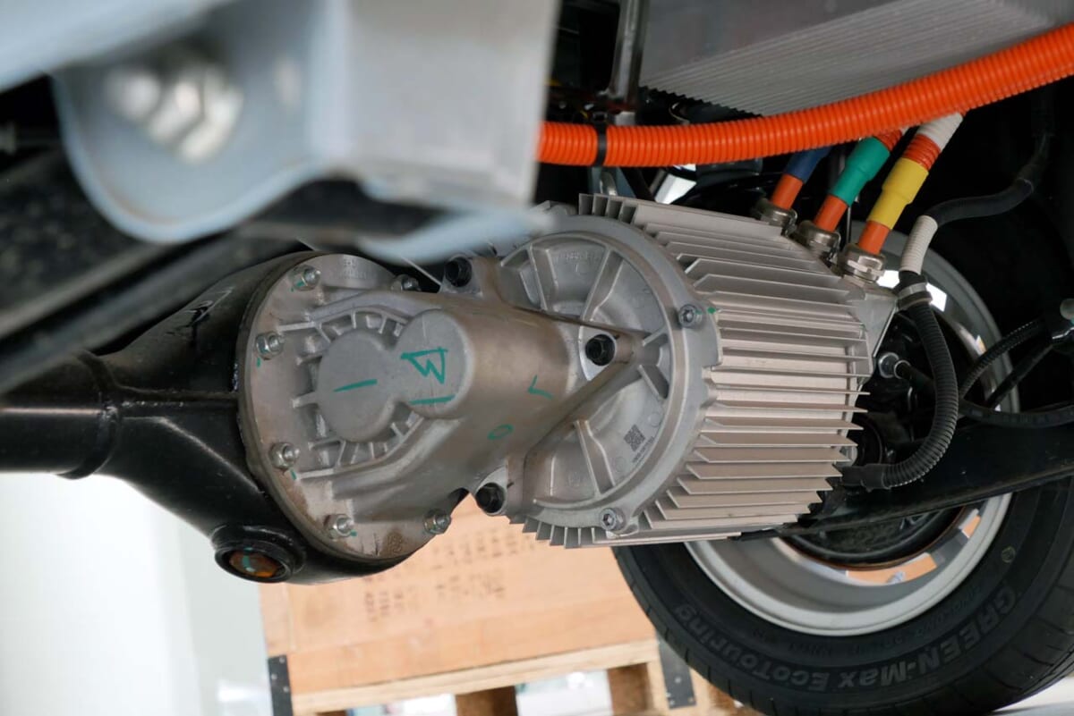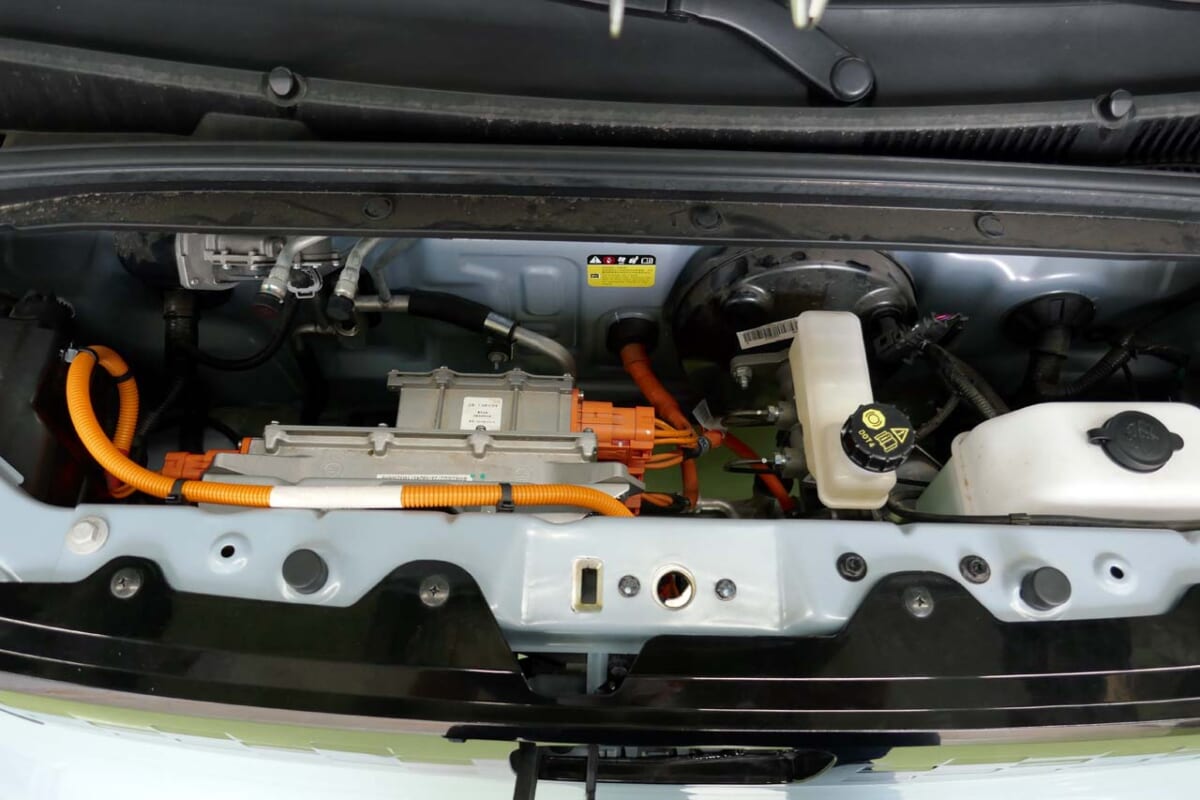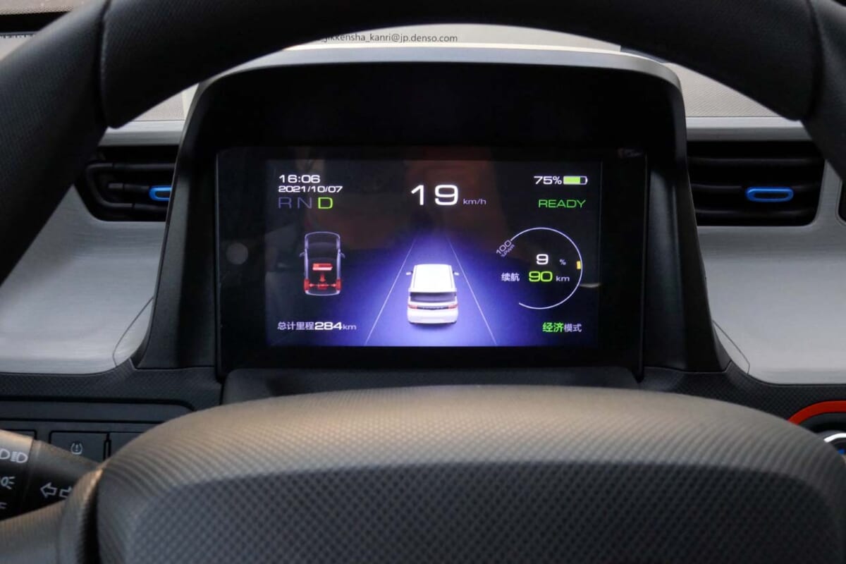 バッテリーは最上グレードのみが13.9kwhですが、試乗できたグレードは9.3kwhとかなり控えめ。電圧も93Vと、EV用としてはかなり低めで、かなり低価格のバッテリーを使っていることがわかります。ただ、100kg近くあるバッテリーを載せているにも関わらず車体重量は700kg未満。そのためか、スペック上の航続距離は120kmと容量の割に長めです。しかも最高速度は100km/hで、中国では高速道路も走れます。なお、充電機能は普通充電のみで、急速充電器には非対応でした。