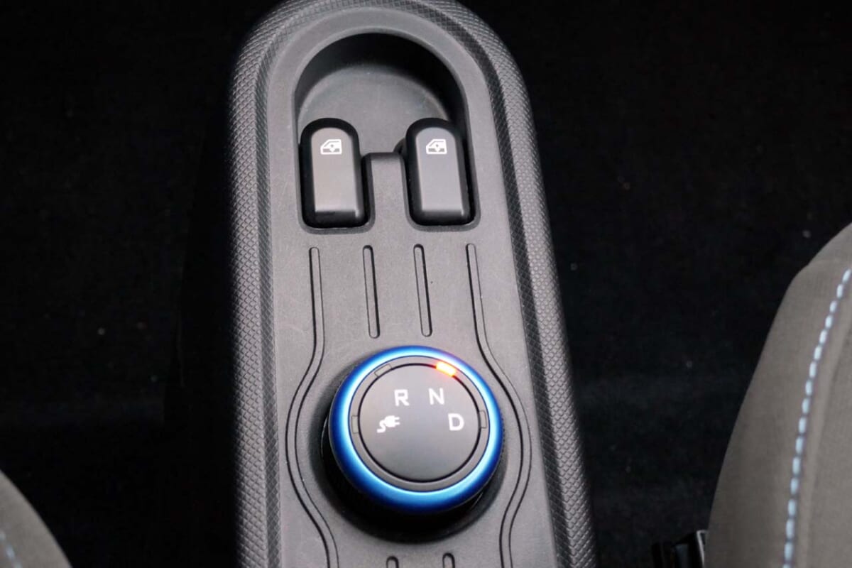 さて、いよいよ試乗です。電源ONするには、キーシリンダーに鍵を挿入して回す懐かしい形式となっていました。思わず「EVなのに?」と思ってしまいましたが、古くても使えるものはそのまま活かす、コスト切り詰め感が伝わってきますね。運転モードはセンターコンソールにある回転式ダイヤルでR(後退)N(中立)D(前進)を選択し、あとはパーキングブレーキを解除してアクセルを踏めばスタートします。