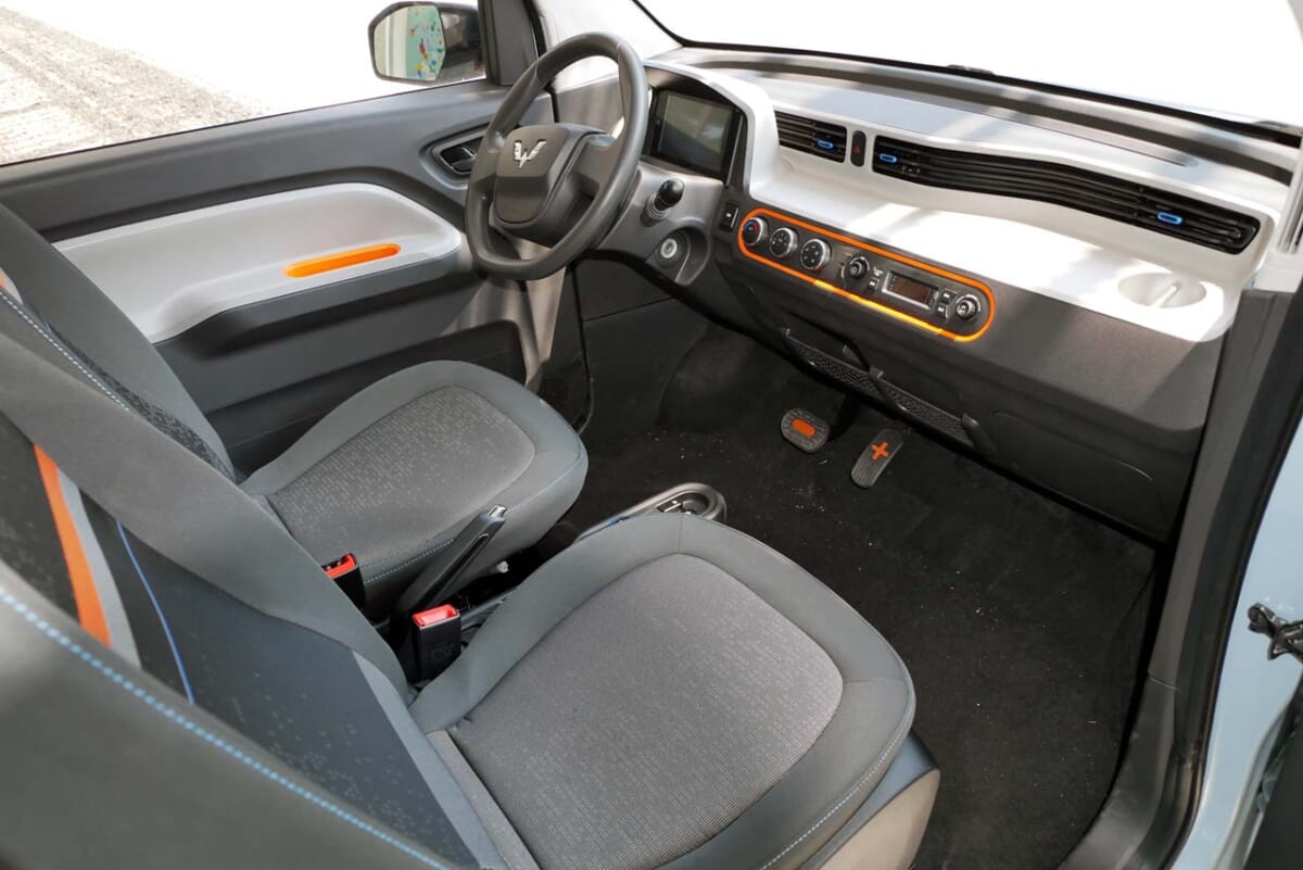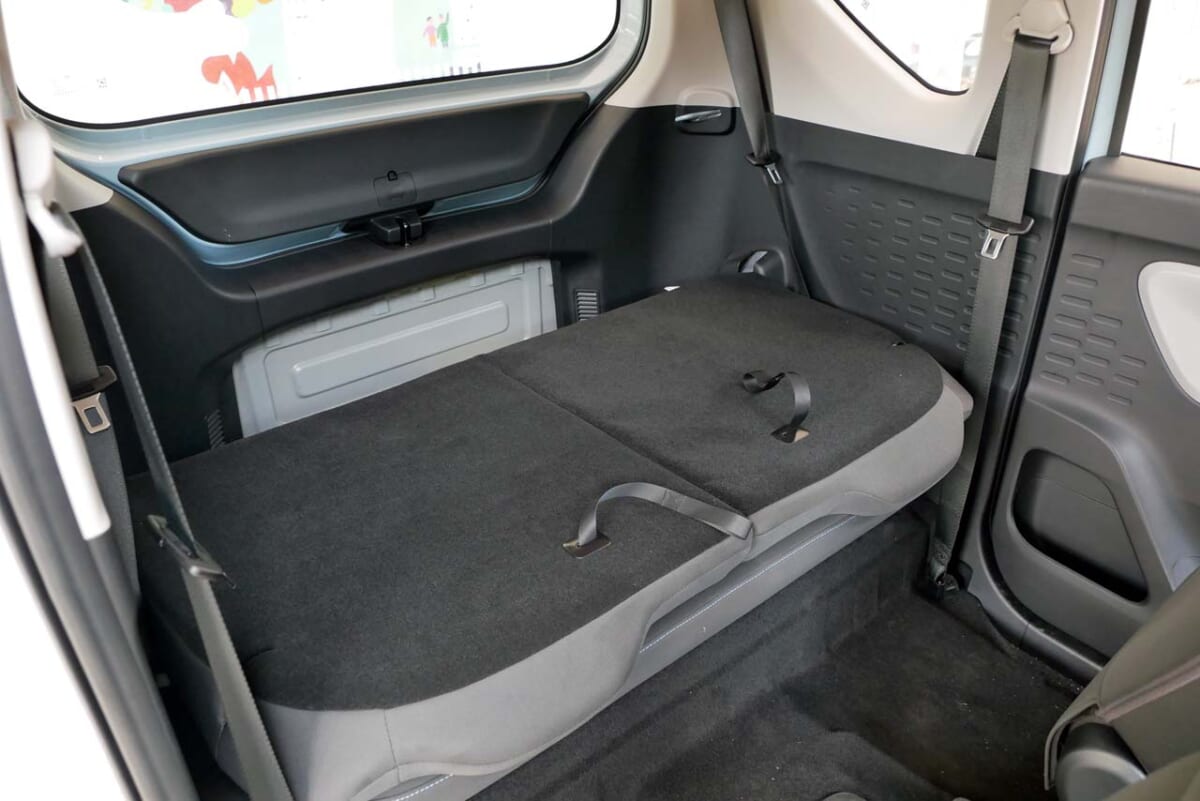 上汽通用五菱のホームページによると、宏光Mini EVのボディサイズは全長2920mm×全幅1493mm×全高1621mmで、日本の軽自動車と比べると、全長で短く(−480mm)、幅でわずかに広く(+13mm)なっています。そのため、定員を4名とするものの、十分な広さを感じるのは前席だけ。後席は大人2人が座るにはかなり窮屈で、実際には“+2”的な使い方となるでしょう。カーゴスペースとしても、後席をたたんでやっと実用になるという感じです。