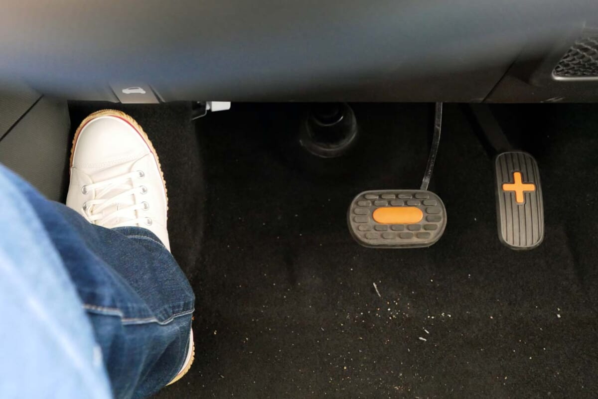 驚いたのが、ペダルの位置です。どういうわけか、全体がかなり右側(助手席側)にオフセットしていて、運転席に座ってペダルを踏むには身体を右側に傾ける必要に迫られるのです。ステアリングシャフトの影響なのかもしれませんが、これは踏み間違えを誘発する原因になるのではないかと心配になりました。だからなのか、ペダルには機能を間違えないように、アクセルが「+」、ブレーキが「-」の表記が大きくされていました。