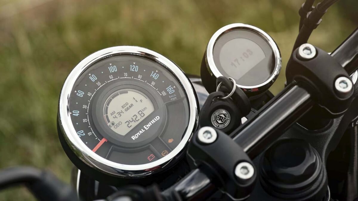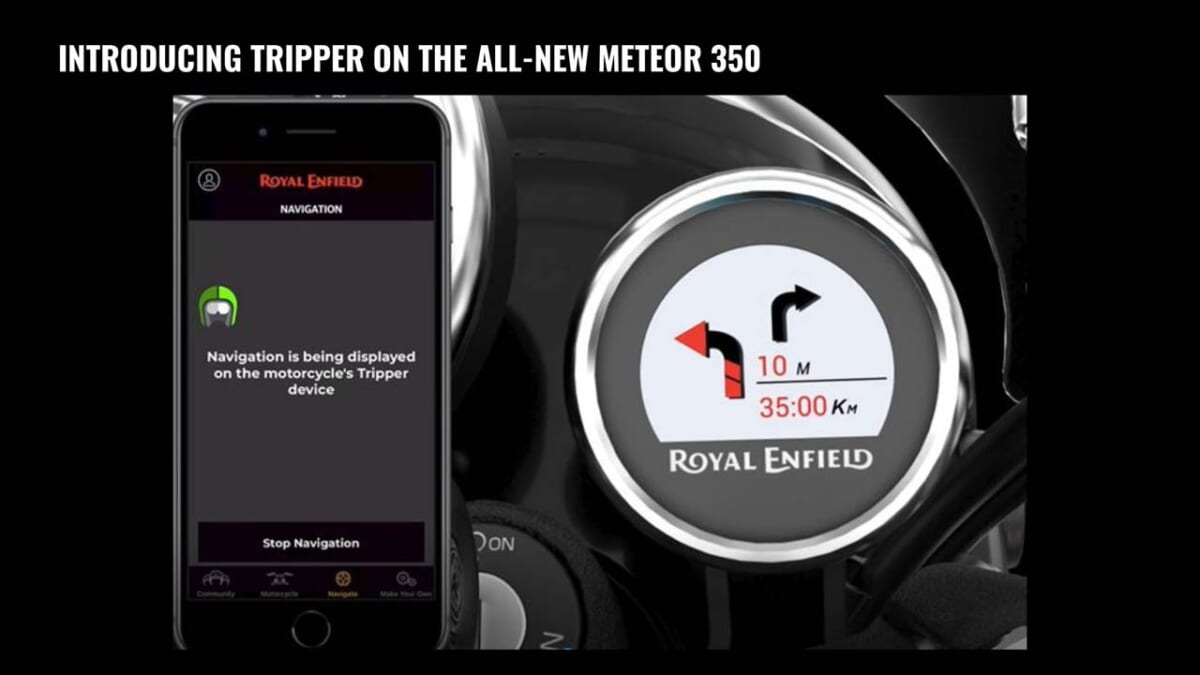 ロイヤルエンフィールドとしては初めて、モーターサイクル用のナビゲーションを搭載したのも大きな特徴です。同システムは「Royal Enfield Tripper(ロイヤルエンフィールドトリッパ―)」と名付けられ、Google マップをベースとしたナビゲーション機能を活用します。スマホにインストールしたオリジナルアプリをBluetoothで連携させることで、メーター右側にあるディスプレイ上でターンbyターンのガイドを実現しているのです。