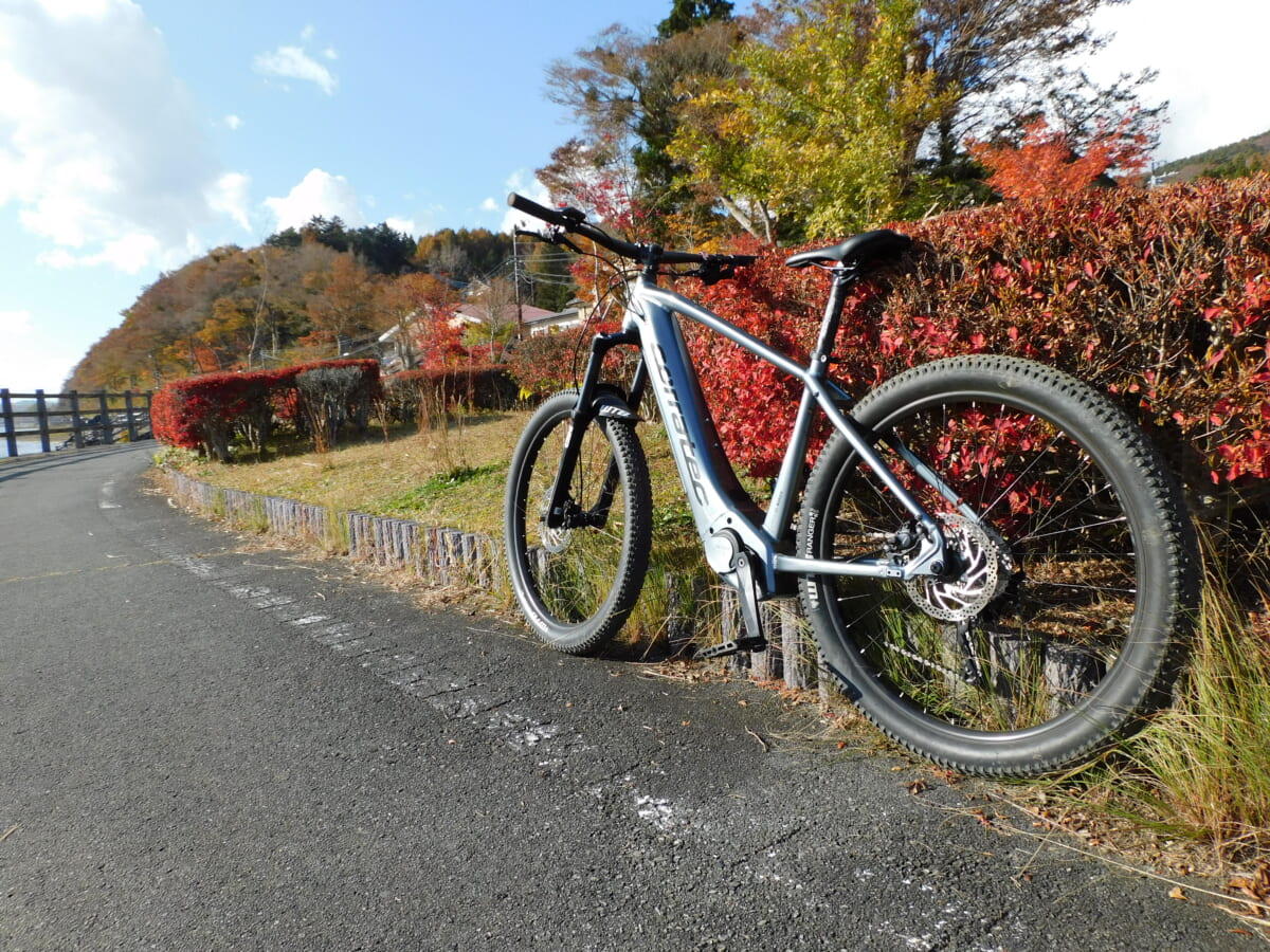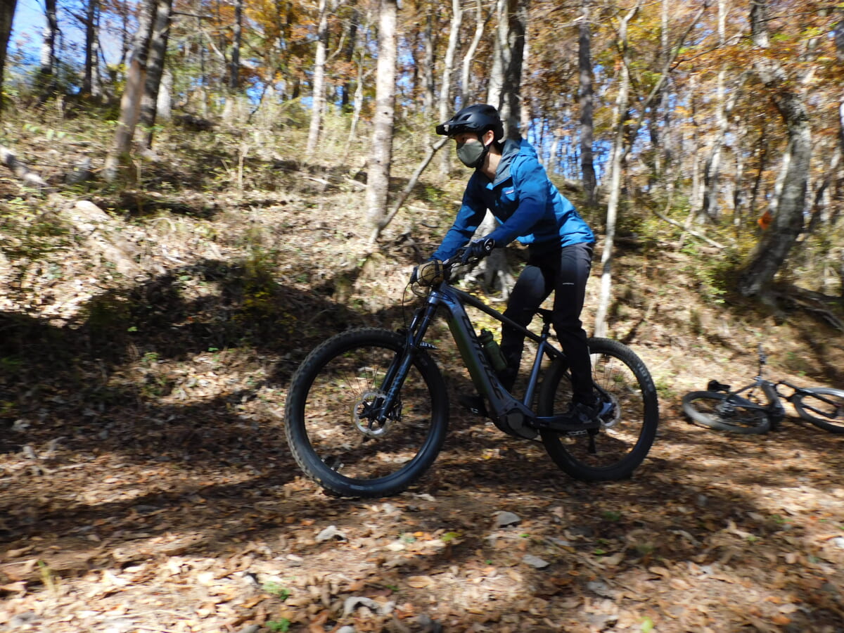 帰路は紅葉に燃える木々の根が露出した荒れた林道を一気に駆け下るダウンヒルを体験。用意された試乗車たちは基本構造がMTBのため、ストローク量のあるサスペンションや剛性の高いフレームが路面の凹凸を吸収してくれ快適でスリリングな走りが楽しめた。かなりハードなルートを走ったことで気が付いたことは、メーカーが異なる各e-Bikeには同型のボッシュ製のアシストモーターが搭載されているのだが、同じスペックでありながらもフレームやジオメトリーの違いによって異なるライド感が味わえたことだ。