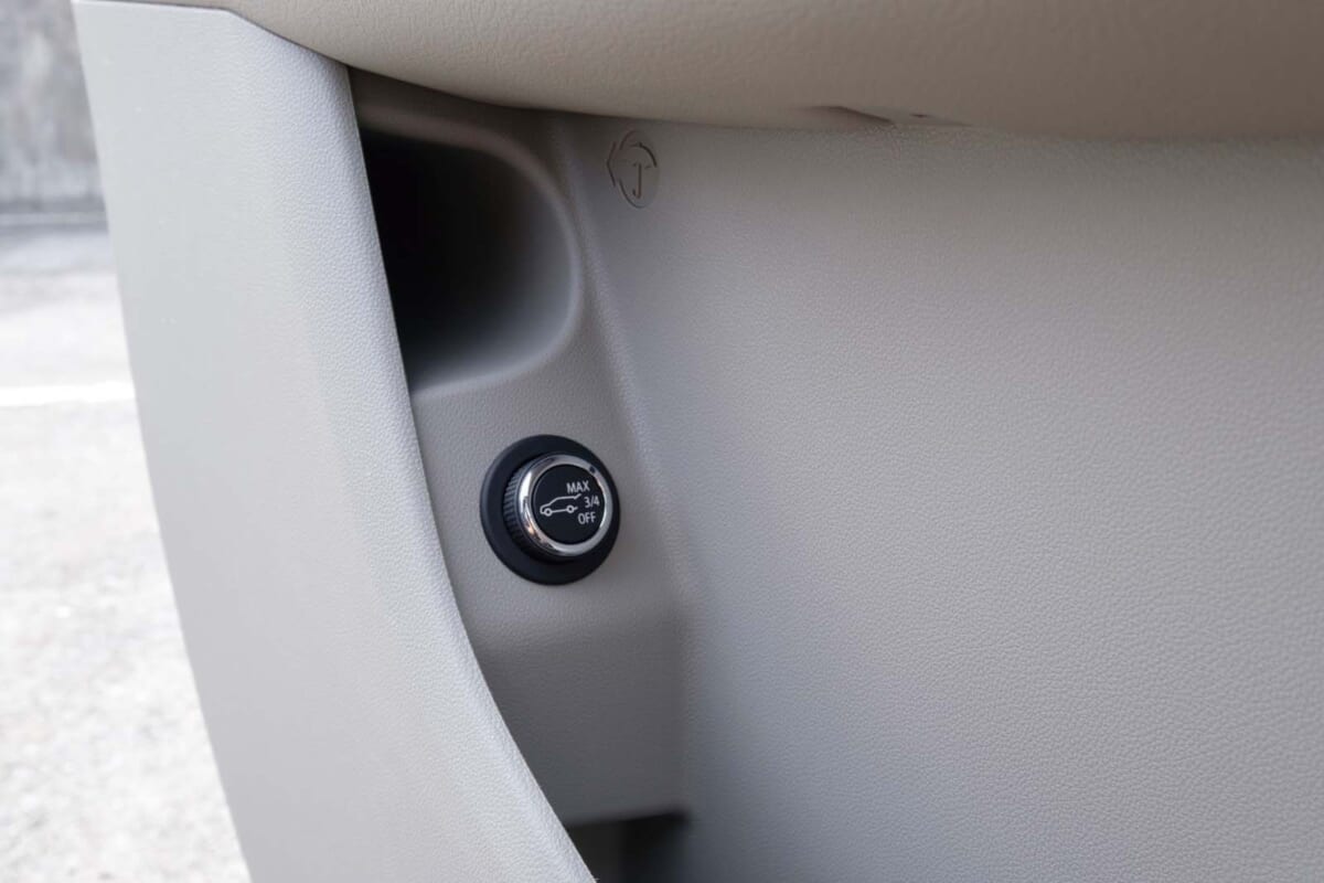ドアに付いていたこの小さなダイヤル。なんだろうと思っていじってみたら、リアハッチゲートの開閉スイッチでした。わざわざドア内部まで配線を通さなくてはならないため作る側も面倒だと思うのですが……。インパネに付け忘れてしまったのでしょうか。