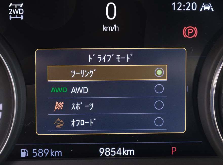 センターコンソールのスイッチを押すことで、ドライブモードが選択できるようになります。「AWD」は4WD固定、「スポーツ」と「オフロード」もありがちですが、「ツーリング」は珍しいです。アメリカらしい表現とも言えます。