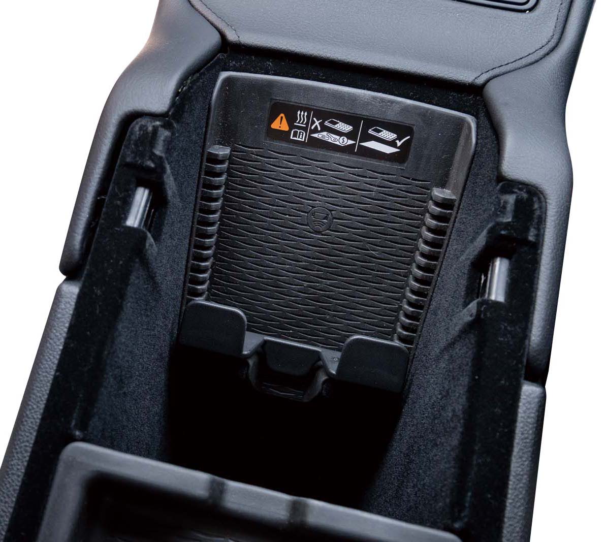 近年、日本車でも多く採用されているスマホのワイヤレスチャージャーが、XT4にもこっそりと肘掛けの下に隠されていました。しかもスマホのサイズに合わせてスケールを変更できる仕様がフレンドリーです。