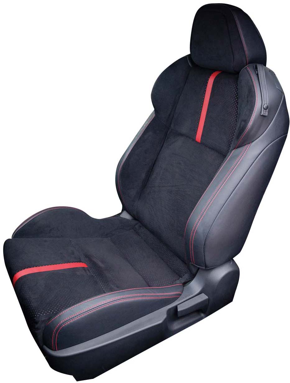 シート形状はホールド性が高く、スポーティな走りにピッタリですが、クッションも厚みがあって座り心地も良好です。さらに、スエード地と本革を組み合わせたコンビネーション表皮が採用されていて、質感が高いです。