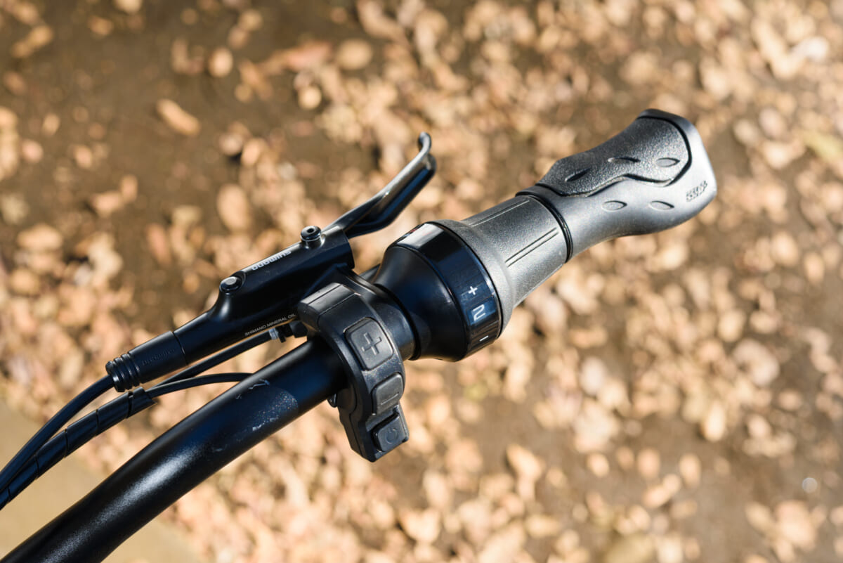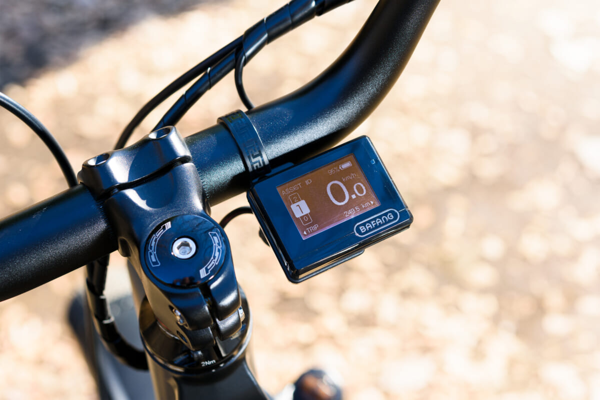 低く跨ぎやすいフレームに、幅広でお尻をしっかり受け止めるシート、それにアップライトなハンドルは街乗りにフォーカスしたモデルであることを感じさせます。ただ、実際に乗ってみると幅の広いハンドルによく効くブレーキの組み合わせは、マウンテンバイクに乗っているような感覚で、ママチャリタイプの電動アシスト自転車とは明らかに異なる上質さです。車重は33.5kgとかなり重いのですが、ペダルを回すと軽々と進むので、その点も普通の自転車とは異なり、新しい乗り物に乗っている感覚。バイクとも自転車とも違うe-Bikeならではの乗り味と言えるでしょう。