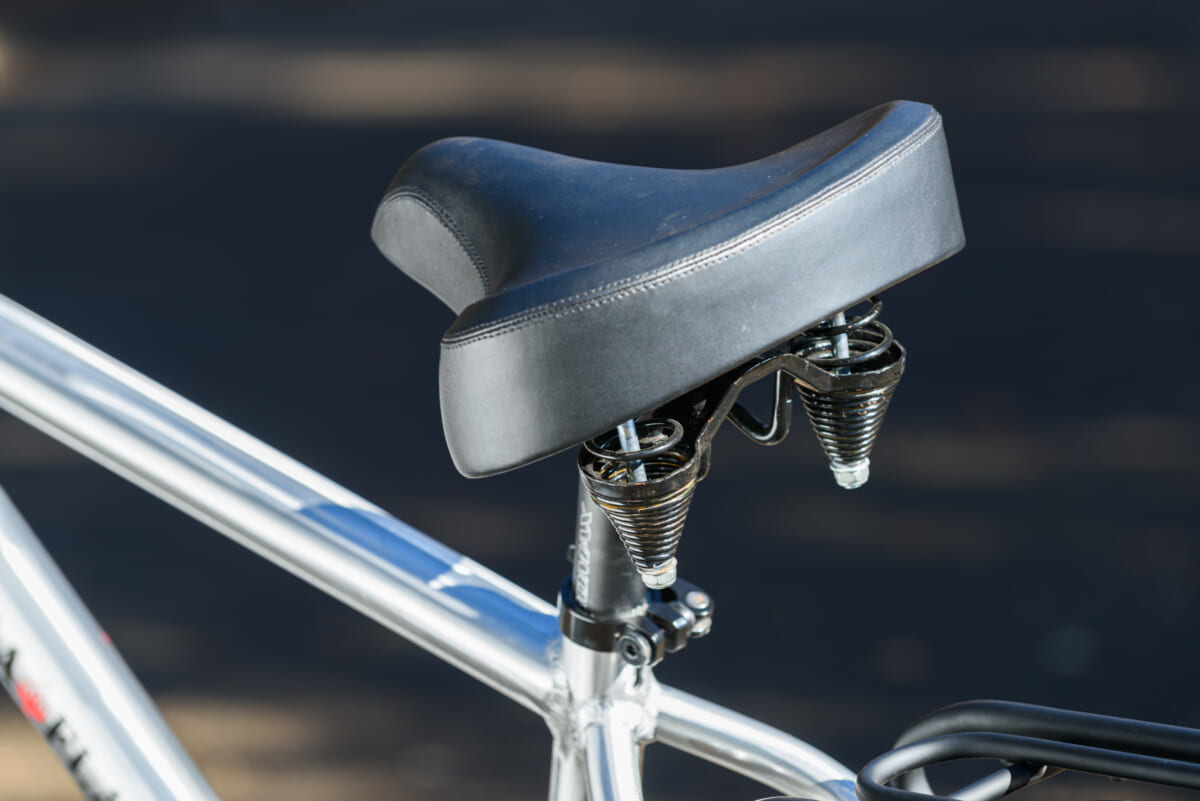 太めのタイヤは抵抗が大きそうですが、ブロックのないスリックタイヤなので走っているとそこまで抵抗は感じません。お尻を受け止める形状のサドルには、スプリングも装備されているので凸凹のある路面でも乗り心地は快適です。アシストの力を借りながら、街中を走るのが適しているモデルといえます。登り坂も走ってみましたが、サドルにどっかりと腰をおろしたままペダルを回しているだけでスイスイと登っていけました。