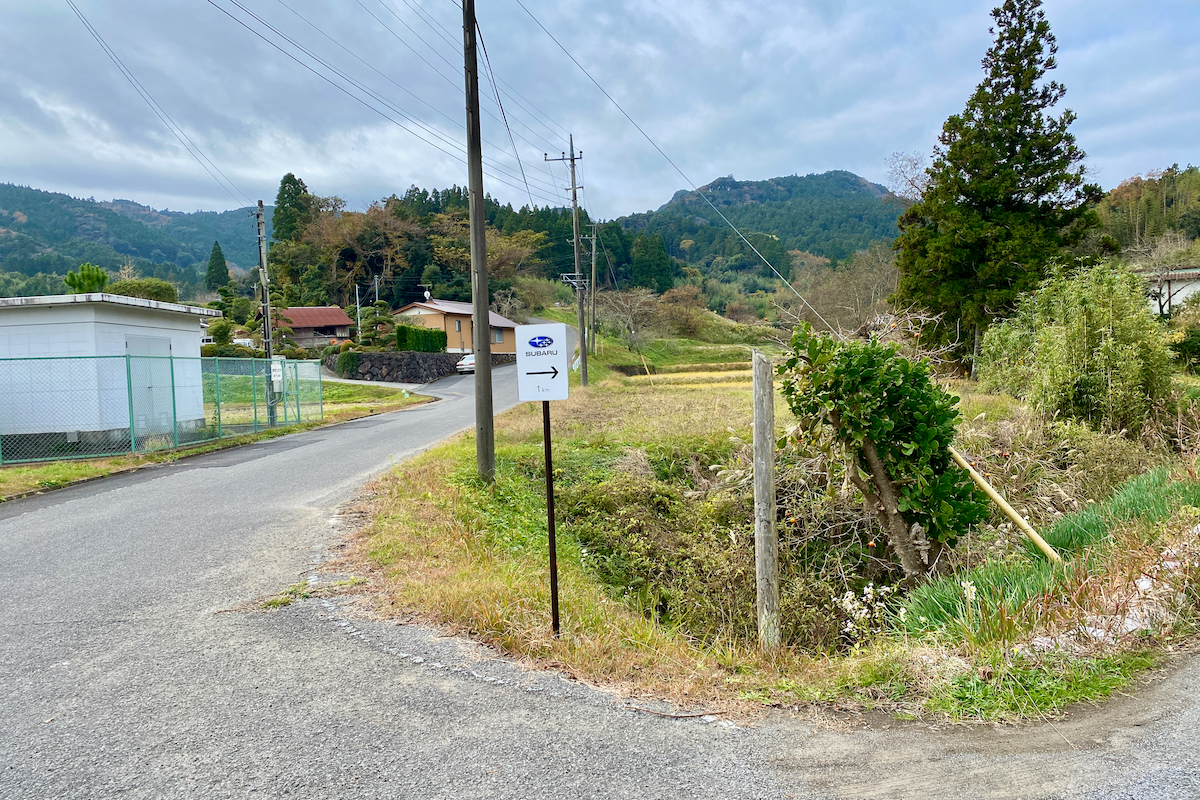 東京からアクアラインで海を渡り、木更津JCTから館山自動車道へ。鋸南保田ICで下道に降りて1時間ほど走ったところに「SUBARU里山スタジオ」はあります。目印の看板を発見!
