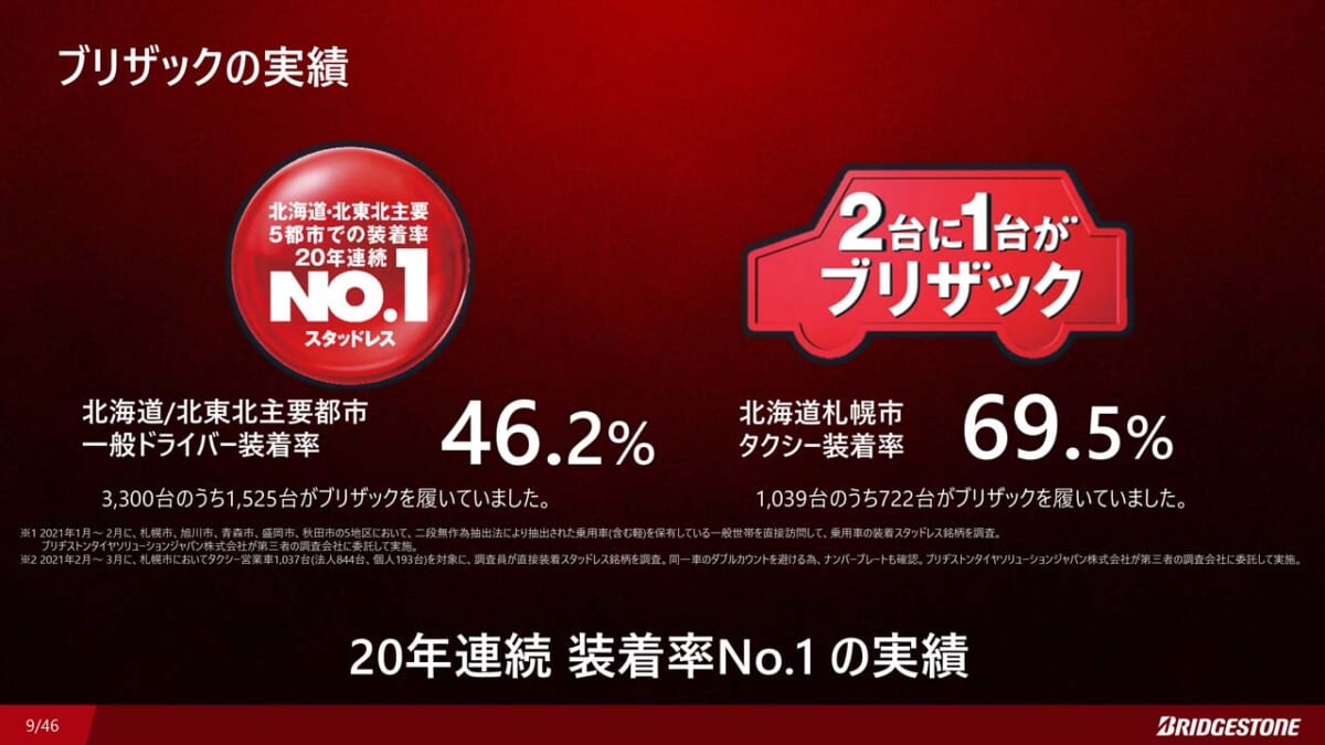 そもそもブリザックといえば1988年に登場以来、33年にわたって進化を重ねてきた歴史あるスタッドレスタイヤです。その評価は特に積雪地で高く、ブリヂストンの調査によれば、北海道と東北北部の主要五都市での一般車装着率はほぼ2台に1台に近い46.2%。札幌市のタクシー装着率に至っては69.5%にものぼる高い装着率! このデータからはブリザックがいかに多くの人から信頼性を獲得しているかが推察できると思います。