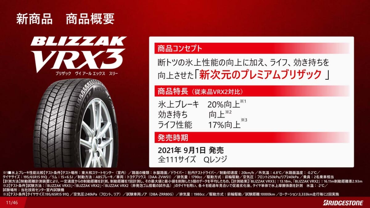 BLIZZAK VRX3はその最新モデルとして、そうした実績を踏まえてさらなる「氷上性能の大幅向上、ライフ性能、効き持ちの向上を実現した新次元のプレミアムブリザック」として誕生しました。ブリヂストンによれば、氷上制動性能を先代「VRX 2」比で20%向上させながら、耐摩耗性などライフ性能も17%も向上させているとのこと。開発陣としては、そのほかにもメインの氷上性能だけでなく、ドライ路面や雪混じりの路面など、非積雪地域での性能向上にも努めたそうで、その性能もぜひ体験して欲しいとも話していました。