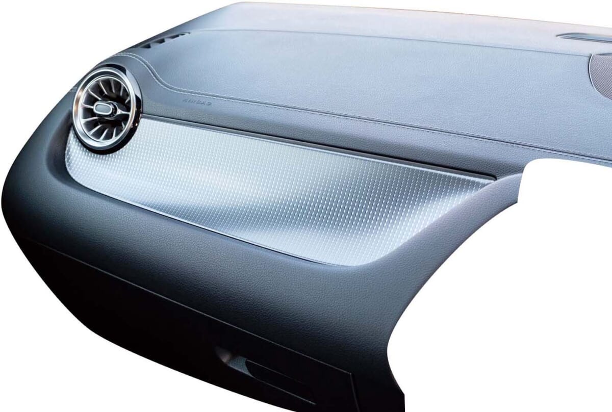 GLAと基本的には同じデザインで、助手席前には微妙な曲線を描くパネルが設置されています。ここは凹んでいますが、物を置いても安定しません。アンビエントライト(間接照明)に連動してうっすらと光ります。