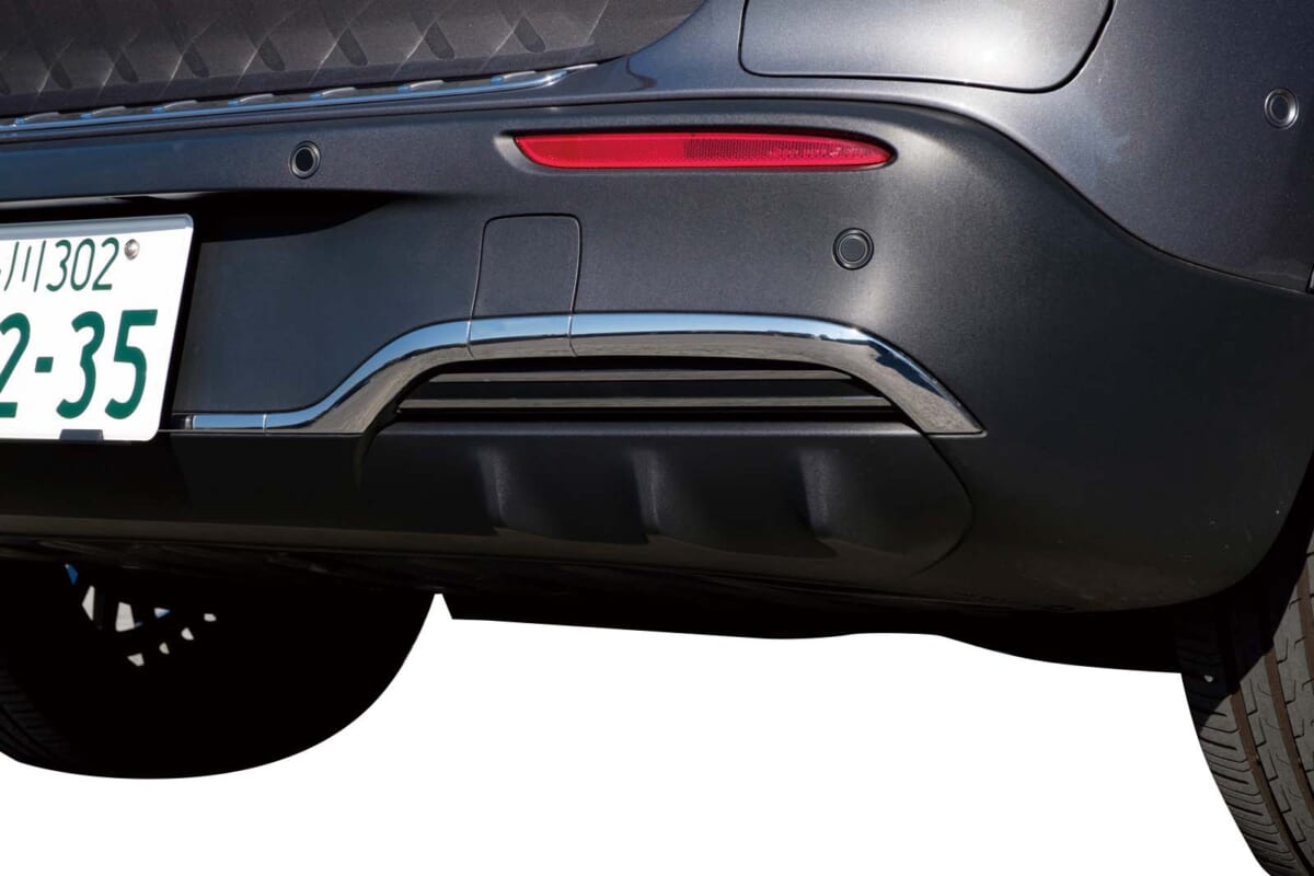 ボディ後方下部、リアバンパーの両端には、えぐれたようなデザインが見られます。ここは本来、ガソリン車であればマフラーの排気管が見えるあたり。排気ガスを排出しないのでマフラーはありませんが、このような痕跡を残すところにメルセデスの遊び心が見られて楽しいです。