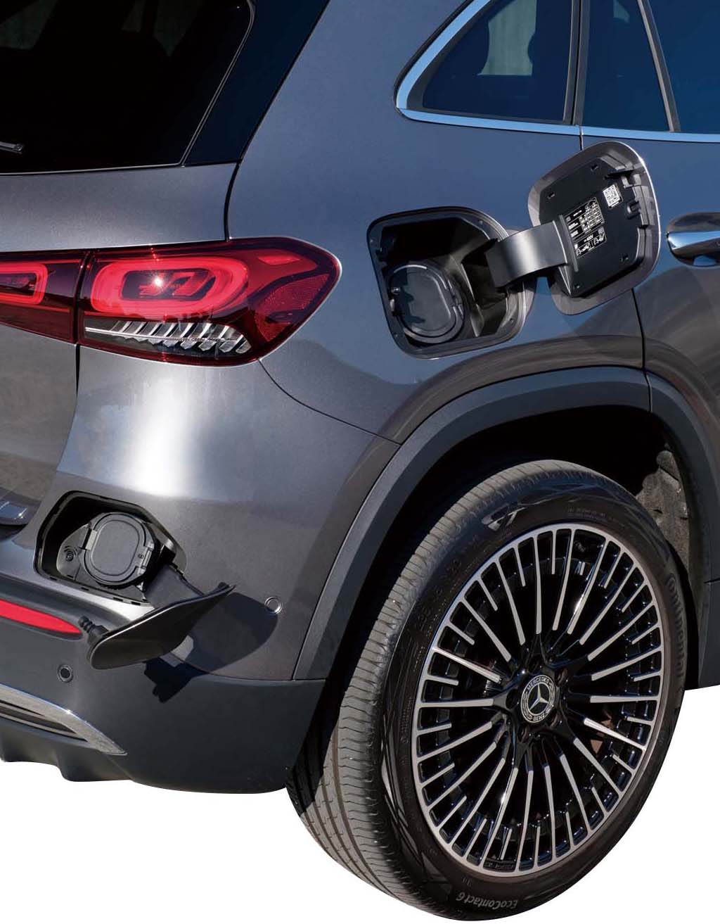 従来のEVだと、フタを開けた中に普通充電と急速充電の給電口が並んでいたり、ボディの左右に分けられていることが多かったのですが、EQAでは右側のフェンダーとバンパーにバラバラに配置されています。あまり美しくありません。